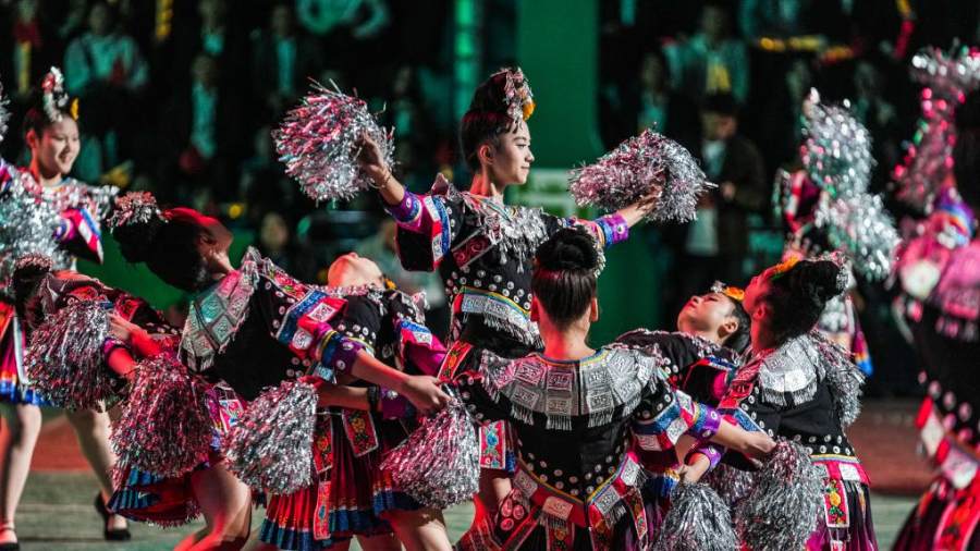 4月13日,演员在启动仪式上进行歌舞表演。当日,大地流彩·2025年全国和美乡村篮球大赛(村BA)启动仪式在贵州省黔东南苗族侗族自治州台江县台盘村举行。 新华社记者 陶亮 摄