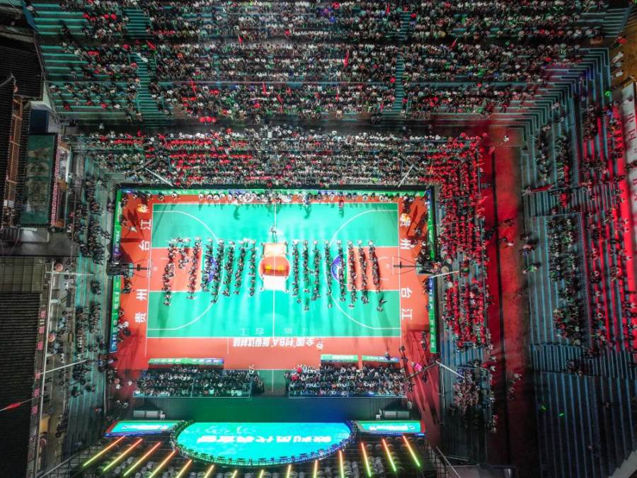 这是2024年3月22日拍摄的2024年乡村篮球球王争霸赛开幕式现场(无人机照片)。当日,以“活力四射 迎‘篮’而上”为主题的2024年乡村篮球球王争霸赛开幕式在贵州省黔东南苗族侗族自治州台江县台盘村举行。本次比赛将从3月持续到11月,是一次跨度长、范围广的全新赛事。 新华社记者 杨文斌 摄
