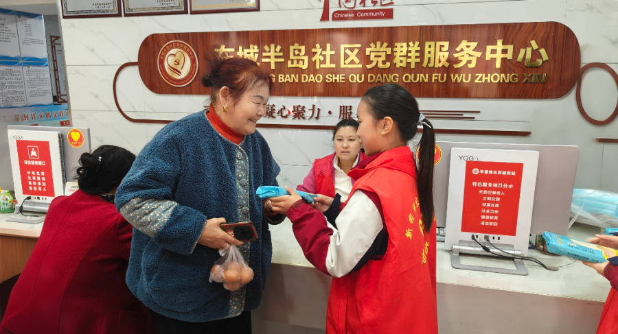 节目结束后,在东城半岛社区工作人员的引导下,学生志愿者分组行动,将社区提前采购的长寿面逐一递到老人手中。“爷爷,祝您健康长寿!”“奶奶,祝您吉祥如意!”志愿者们的问候温暖真诚,社区工作人员则在一旁协助搀扶行动不便的老人,校社分工协作,让送暖环节井然有序。81岁的王奶奶接过长寿面,感动地说:“谢谢孩子,也谢谢社区想着我们,这份心意我得好好珍藏。”