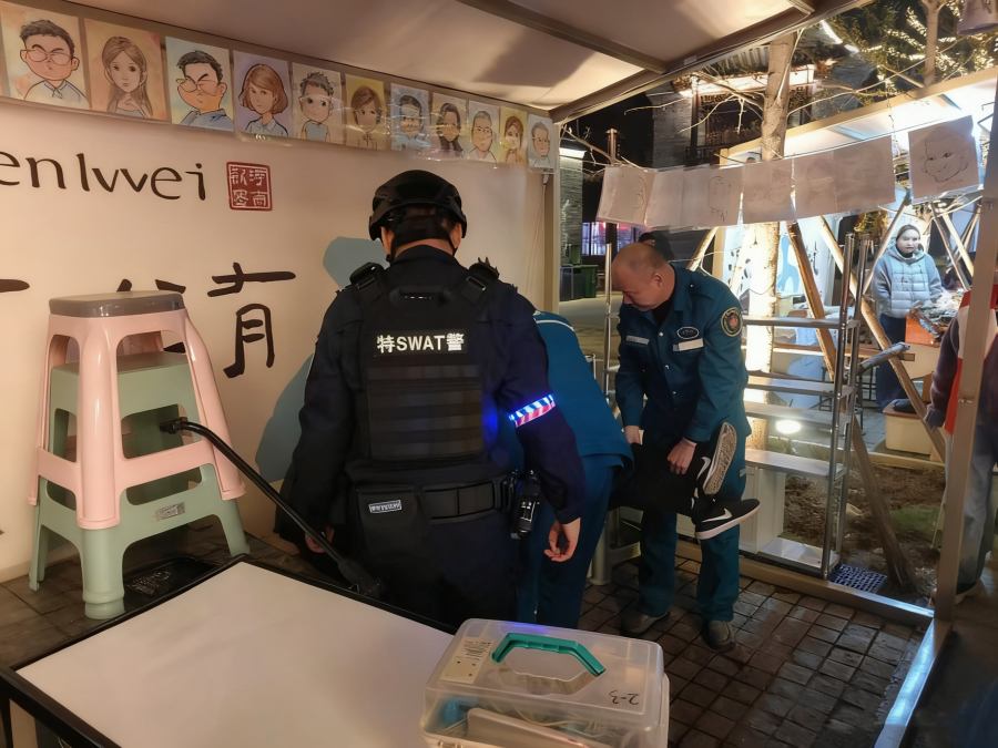 当晚8时许,巡特警大队侯辛磊、张亚冰、李鹏帅等人正在溱洧水城开展巡逻。突然,人群中传来惊呼:“有人晕倒了!”时间就是生命!他们以最快速度冲向事发地点。只见一名约60岁的男性游客倒在地上,面色苍白,情况十分危急。