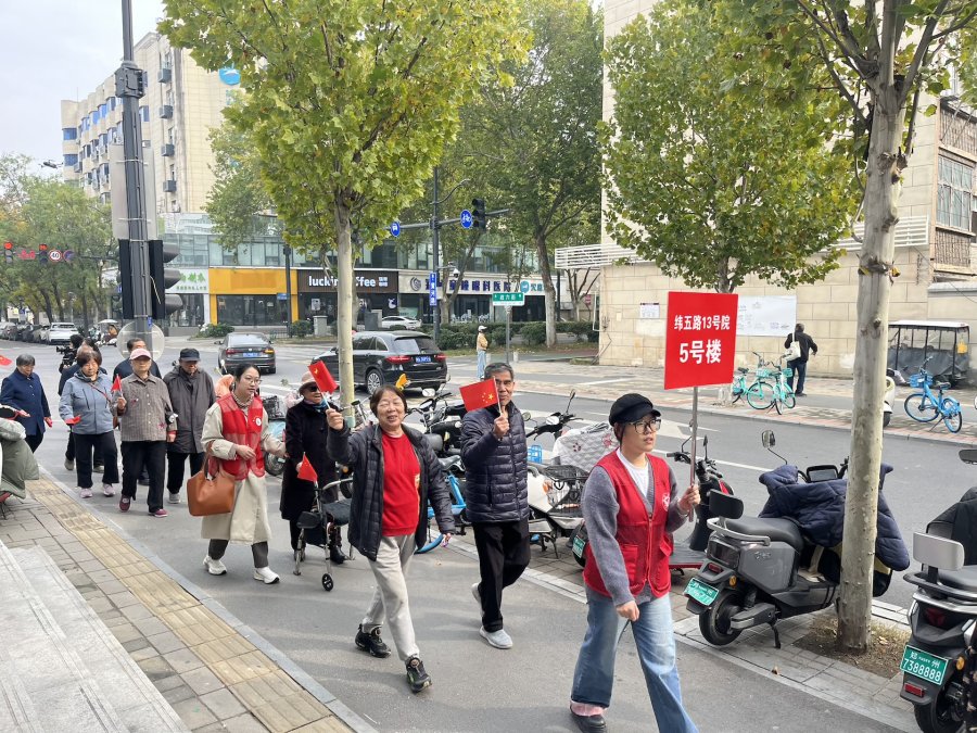 行走途中,亮点不断。活动从花园百姓大舞台出发,社区特别启用航拍设备全程跟拍。当镜头缓缓掠过整齐的队伍,居民们纷纷挥舞手中的国旗,向天空绽放灿烂笑容,构成一幅动人画卷。志愿者团队全程暖心护航,不仅悉心帮扶年长及行动不便的居民,还贴心播放节奏明快的背景音乐。大家踏歌而行,一路欢声、一路笑语,成为秋日社区里最温暖的一道风景。