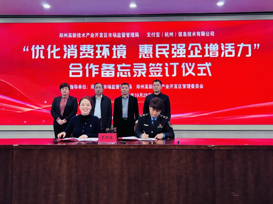 仪式上,调研员王军亮与蚂蚁集团北方技术服务中心/数字马力(郑州)有限公司总经理余立分别发表致辞,表达了对新模式的高度期待与坚定支持。随后,在全场瞩目下,高新区市场监管局与支付宝(杭州)信息技术有限公司正式签署合作备忘录,标志着“线下消费纠纷云端和解”模式正式落地。