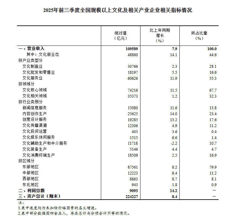 据国家统计局网站消息,据对全国8.1万家规模以上文化及相关产业企业(以下简称“文化企业”)调查,2025年前三季度,文化企业实现营业收入109,589亿元,按可比口径计算(详见附注2),比上年同期增长7.9%[1]。其中,文化新业态特征较为明显的16个行业小类[2]实现营业收入48,860亿元,比上年同期增长14.1%,快于全部规模以上文化企业6.2个百分点。