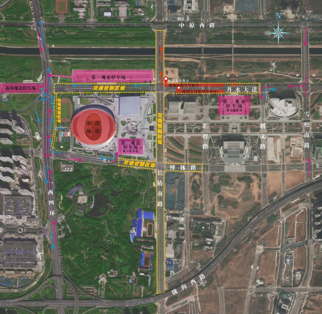 设在郑州CCD PARK地下停车场。观众车辆沿雪松南路——丹水大道(向西)——经创文路驶入停车场——进入地下停车场停放(丹水大道与创文路交叉口以西禁止观众车辆通行);退场时,车辆驶出停车场出口后——经丹水大道向东驶离活动现场。请扫描下方二维码导航前往停车场。该停车场饱和后,请根据交警及工作人员指挥或导航提示,前往其他停车场停放。