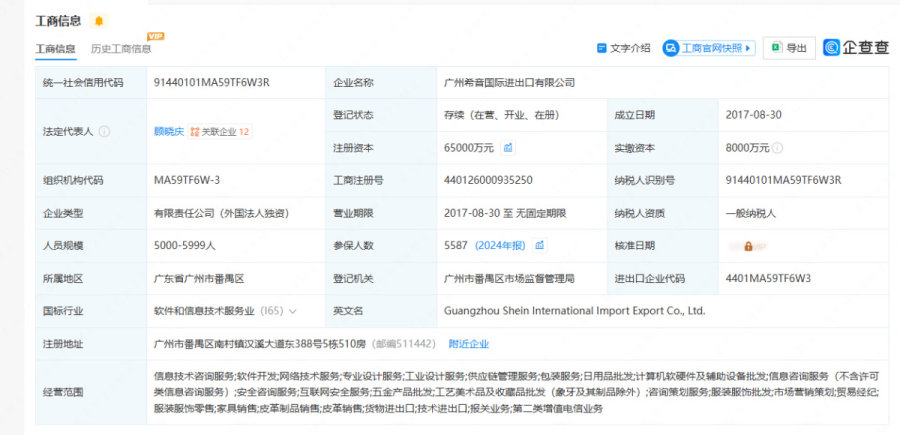 记者在企业信息查询平台查询发现,SHEIN在中国的公司,也大多由新加坡总部控股。其在国内关联最大的企业为广州希音国际进出口有限公司,注册于广东省广州市番禺区,注册资本为6.5亿元,由ROADGET BUSINESS PTE.LTD.(Shein新加坡总部)100%持股。