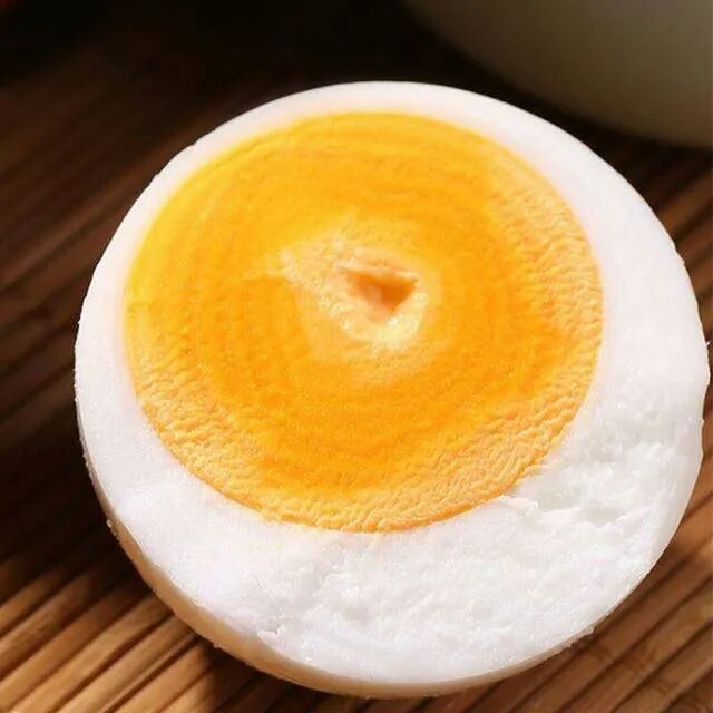煮熟后,蛋黄呈黄红色,呈现一圈圈不同的色环,红黄相间绕着中心,很特别。