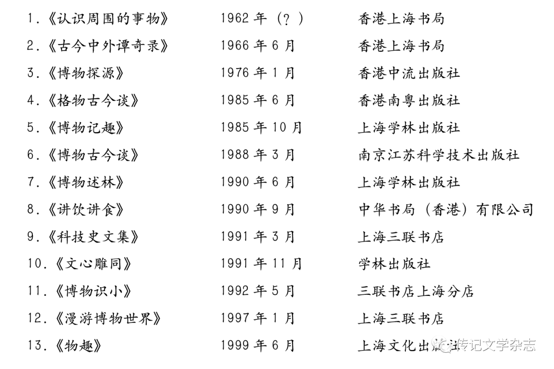 1990年6月,吴先生出版他的第7本著作《博物述林》时,在《后记》之后还有一则《附启》,开列他的7本“博物识小”系列书目,我以此为基础加以增补,共得13种: