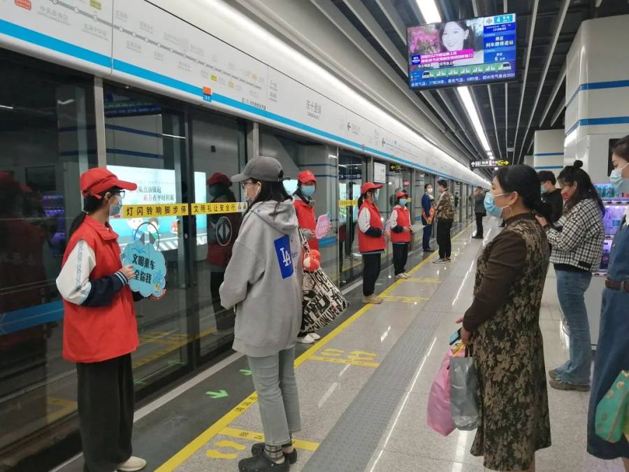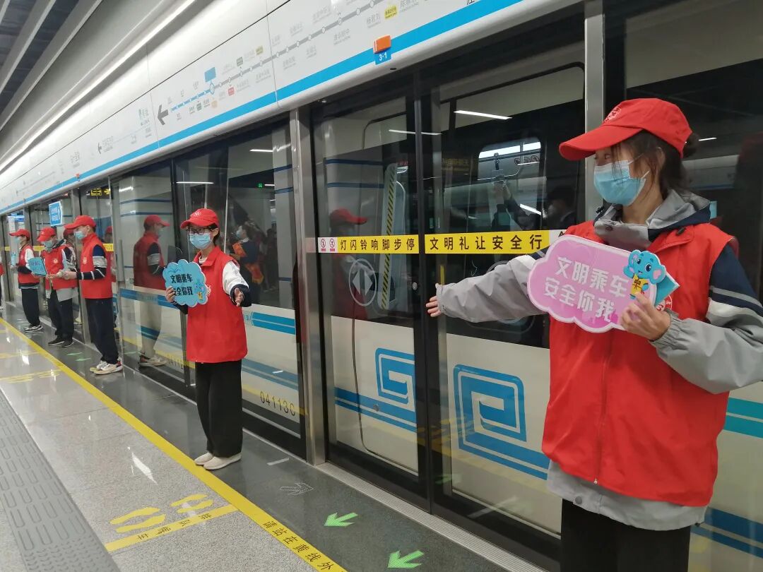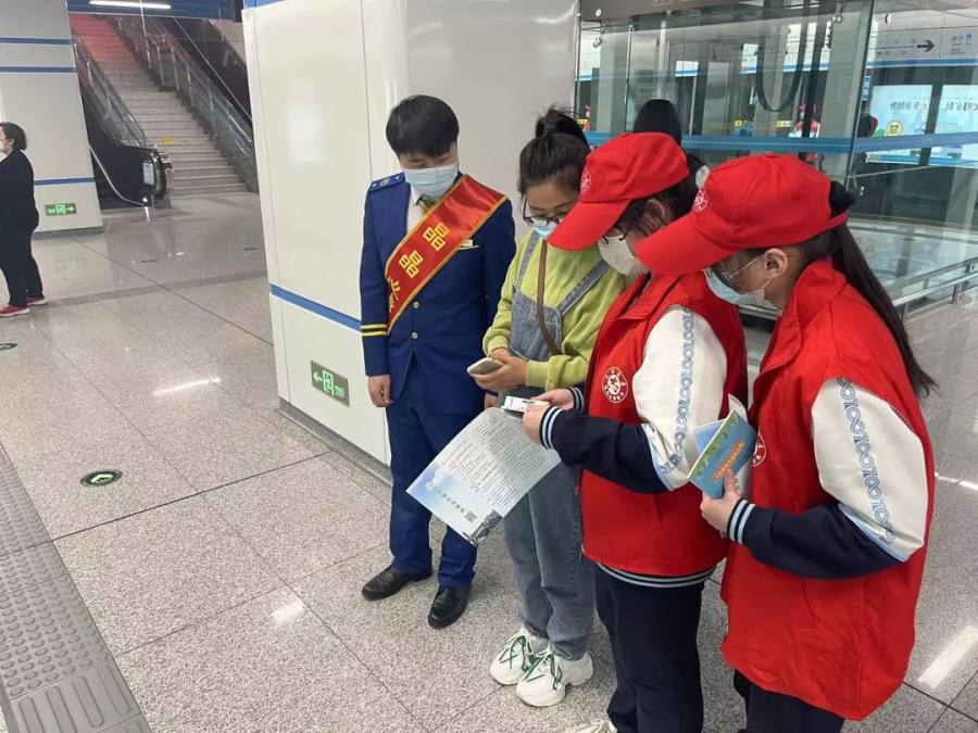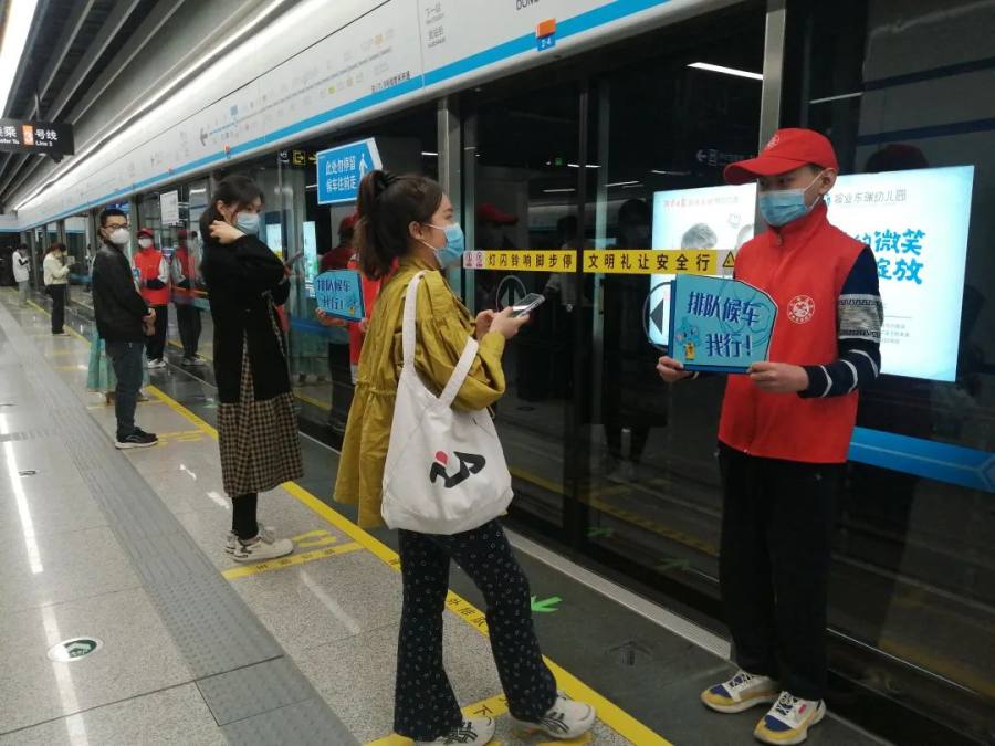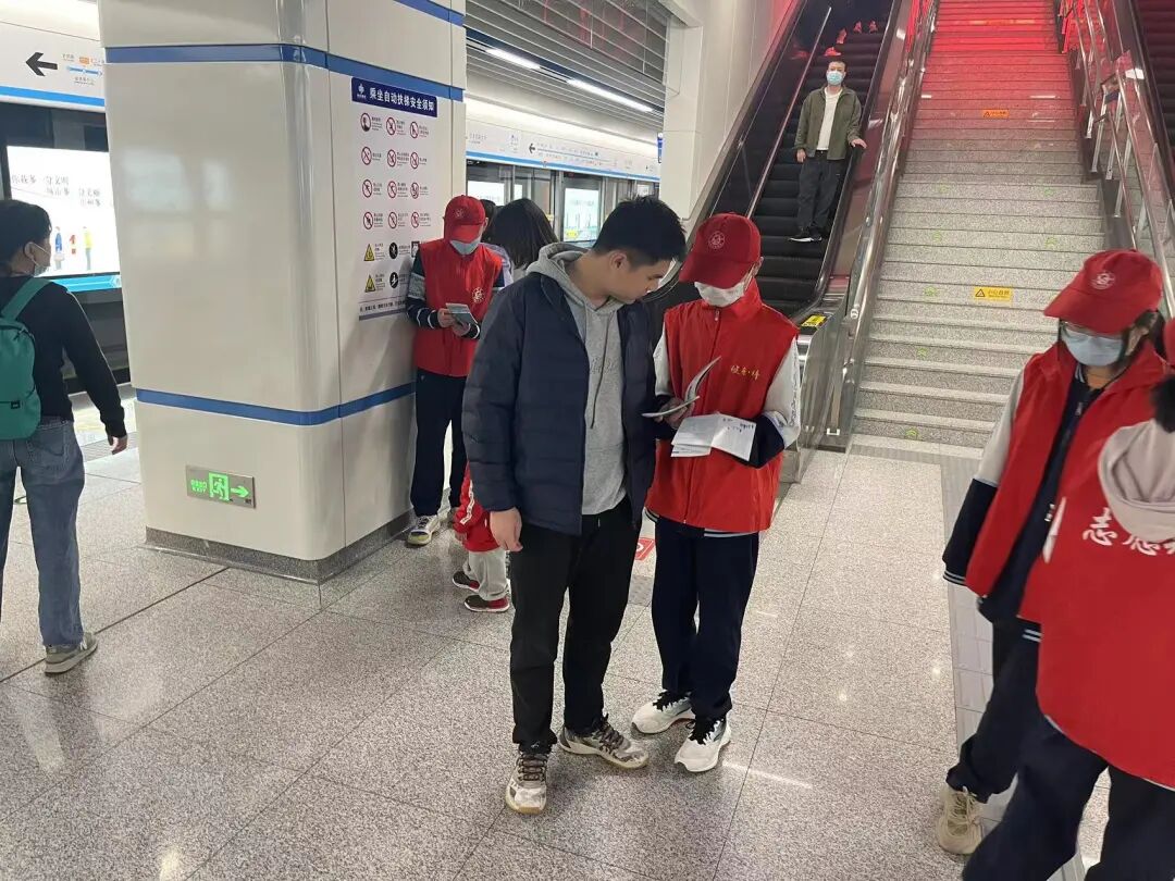 在站台引导排队候车期间,带领志愿者一起为乘客发宣传册讲解文明出行知识、体验排队候车引导。