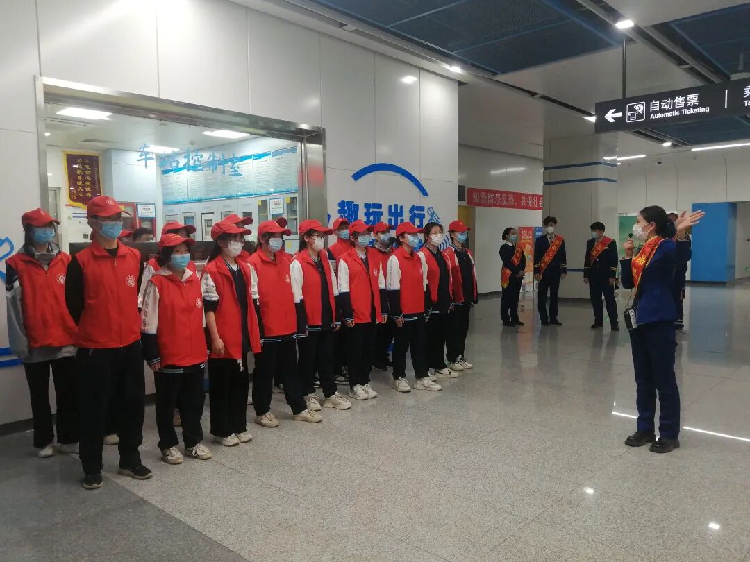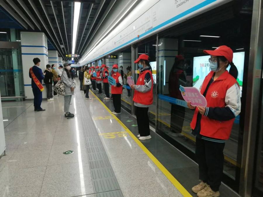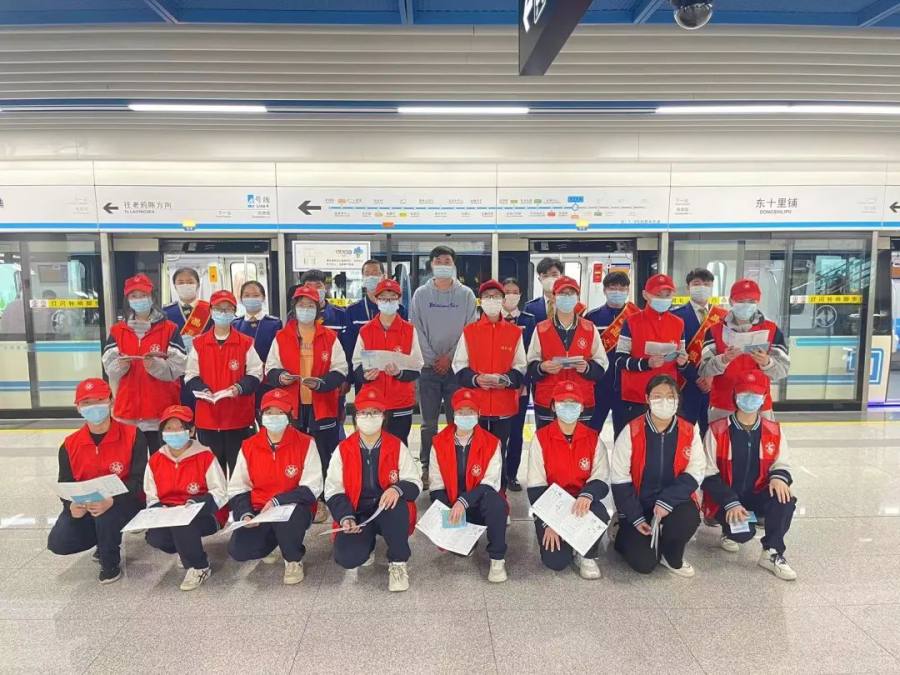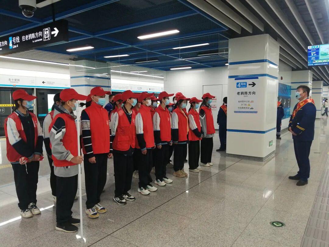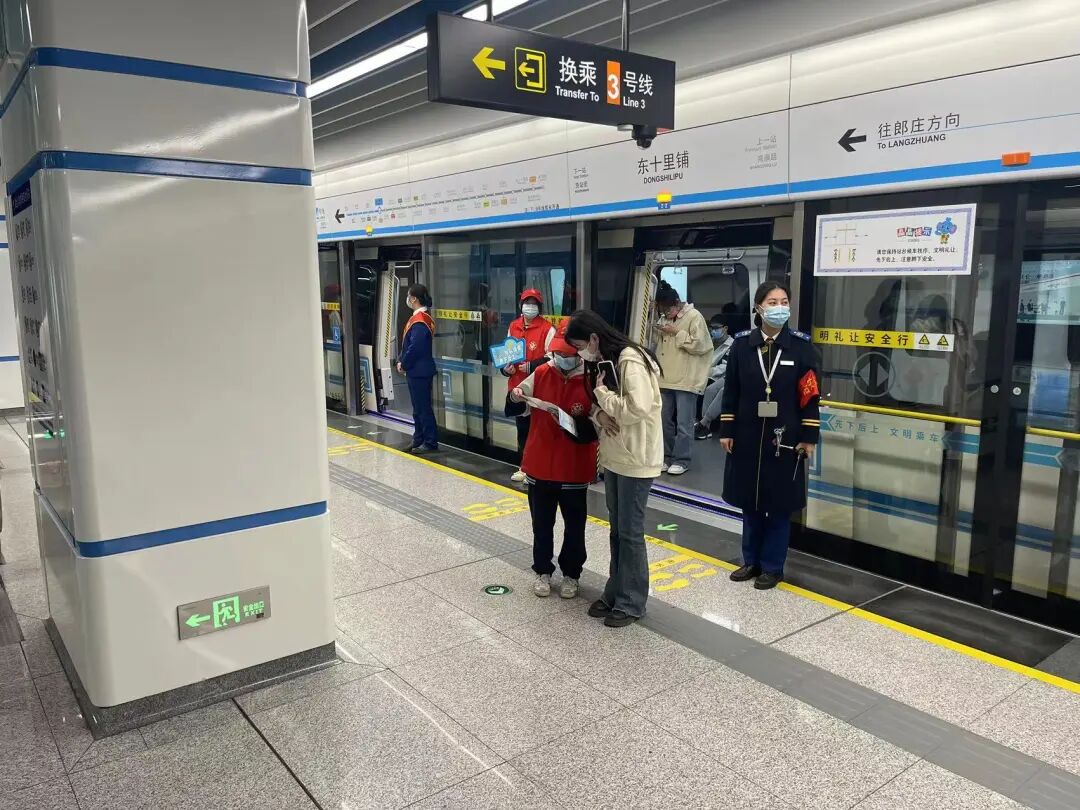 在站台引导排队候车期间,带领志愿者一起为乘客发宣传册讲解文明出行知识、体验排队候车引导。