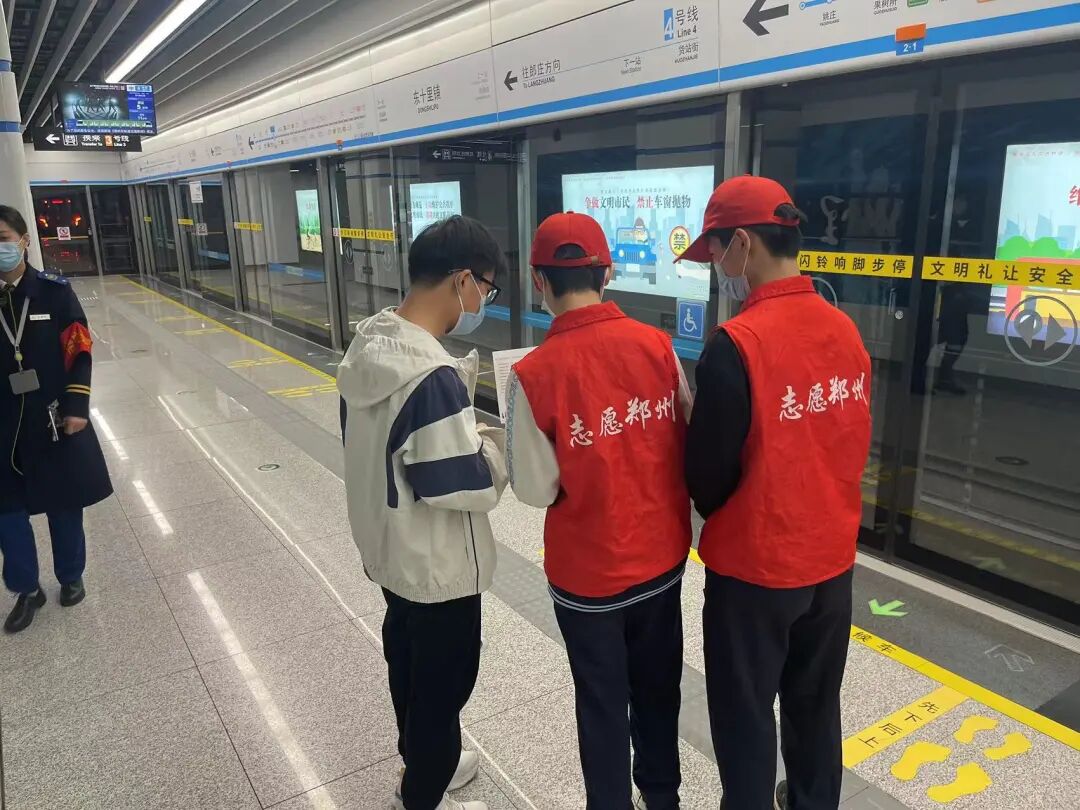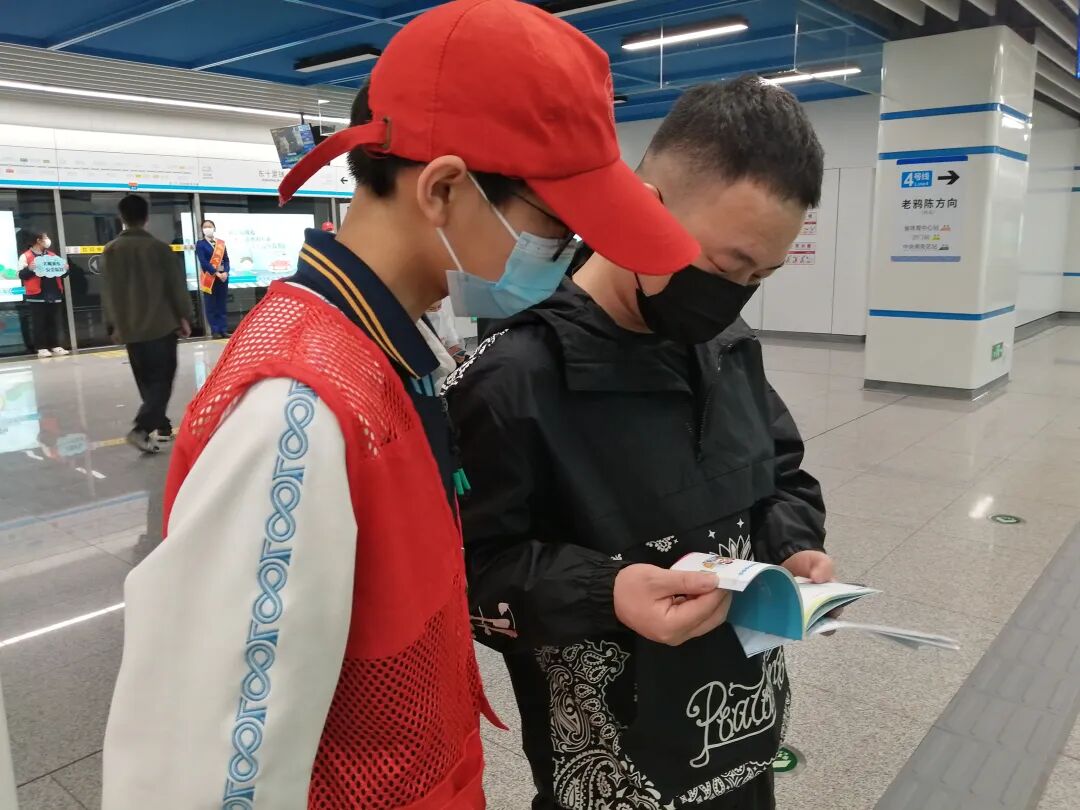 志愿者为乘客宣传文明行为促进条例并发放宣传页和宣传册