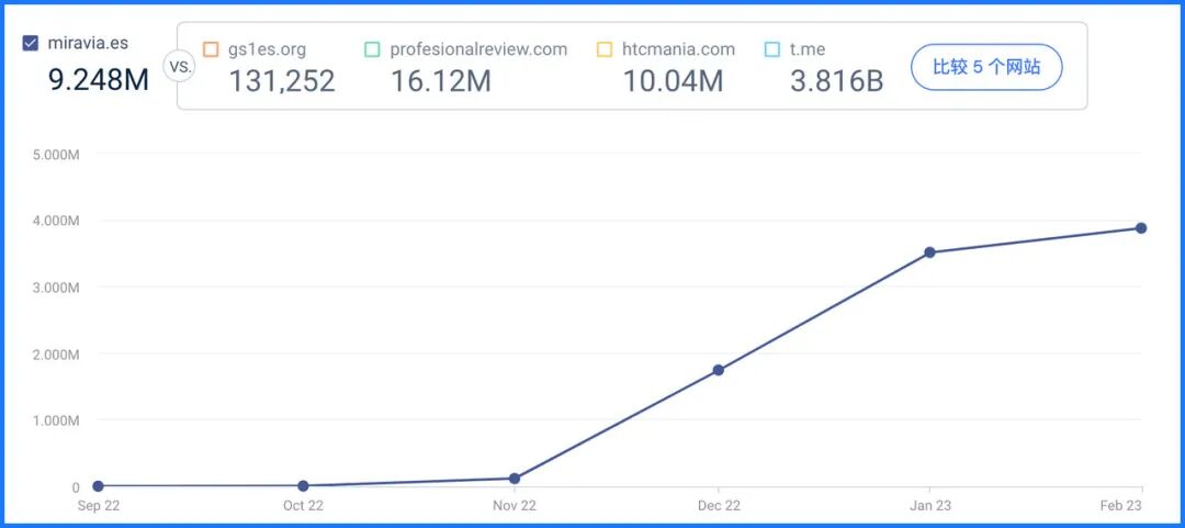 根据网站数据分析平台Similarweb的数据显示,从自去年12月到今年2月底,Miravia.es网站(电脑和移动端网页)的总访问量超过900万。