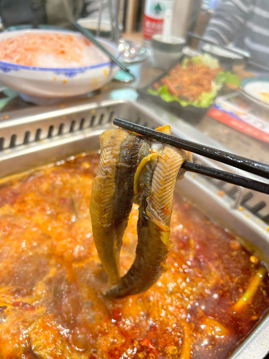 红汤中煮沸,鳝鱼入锅,10分钟后吸饱汤汁捞出,口感厚实、肉质Q弹、鲜嫩入味,蘸上四川火锅经典的蒜泥油碟,香辣不腥,鲜香盈口,滑嫩无伦。