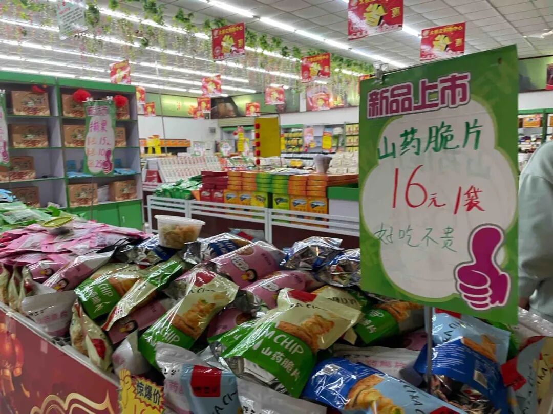 摆满山药脆片、山药粉的超市