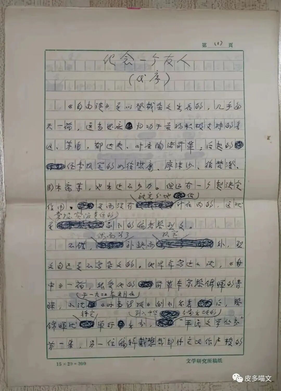 唐弢为《〈申报 自由谈〉杂文选》所作代序手稿第一页