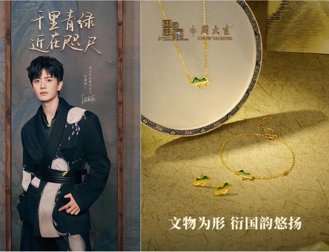 其中,青绿珐琅工艺产品的核心特点是提取了名画中的青山元素,采用经典青绿设计和珐琅工艺、锤纹工艺以及宫廷古法金制金技艺。针对这一产品类型,周大生通过图文、短视频和直播内容重点解读产品的高颜值,生动展示相关产品还原了《千里江山图》中肌理脉络与明暗变化,且做到了黄金华而不炫的大气质感,并把这些内容在微博、淘宝、小红书、抖音等全网渠道定向推送给该产品类型的核目标人群——任嘉伦粉丝、送礼人群、品质女性人群、传统文化爱好者和时尚人群。