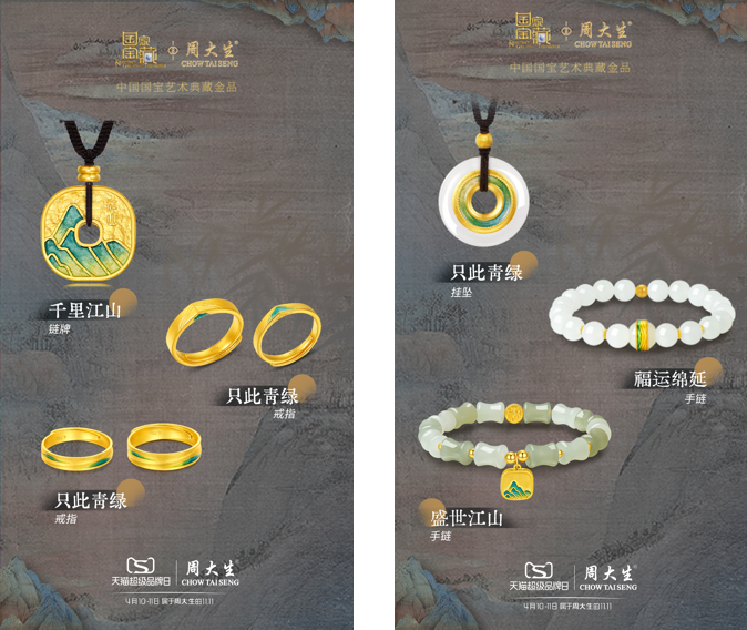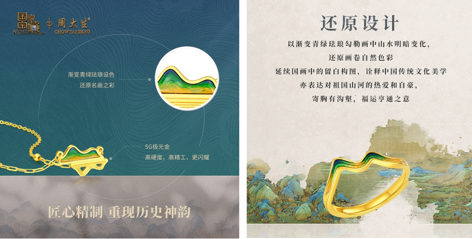 “有美(外观)、有品(品质)、有趣(故事表达)”的国潮表达,市场很快给周大生的业绩带来了正向反馈。数据显示,2022年双11活动期间,全网成交额达9.4亿元,首次超过行业老大“周大福”;2022年,周大生的营收规模超过111.18亿元,同比增长21.44%。提起卡地亚,人们脑海里马上想起“平安符”,提起Tiffany想起蒂芙尼蓝的“T”标志,每家成功的珠宝品牌都有着独特的代表作,既是爆品,也能代表品牌。在周大生电商营销负责人苏畅看来,千里江山系列未来可能是能够代表周大生品牌的产品系列之一。周大生千里江山系列产品,就是新中式国潮珠宝的代表。其灵感来源是北宋王希孟创作的《千里江山图》,周大生将青绿山水与倒影的绝色,延伸到现代产品表达,使用了山水相映的意境,以物寄情,希望表达出一种寄情山水、胸有丘壑的开阔之意境。