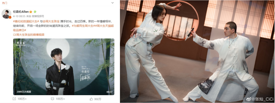 在线下,打造沉浸式互动体验展,众星云集“大生茶楼”,快闪表演吸引超高人气客流,让用户深度体验“国潮”文化魅力,充分将国潮因素与品牌基因进行融合宣传,打破年轻一代对珠宝饰品的固有认知。“这次天猫超级品牌日的营销活动,目的是打造出周大生的国潮形象,设计灵感TVC是大脑,核心躯干是大生茶楼线下国潮展,其上肢是快闪节目的渗透表达,下肢是数字人天妤、代言人任嘉伦二度官宣作为支撑。”苏畅具体解释道。说唱歌手@宝石Gem及数字人天妤在大生茶楼