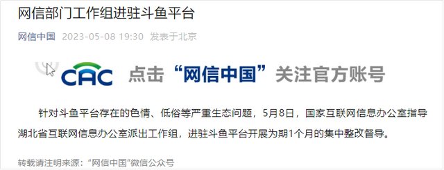网信中国表示,针对斗鱼平台存在的色情、低俗等严重生态问题,国家互联网信息办公室指导湖北省互联网信息办公室派出工作组,进驻斗鱼平台开展为期1个月的集中整改督导。