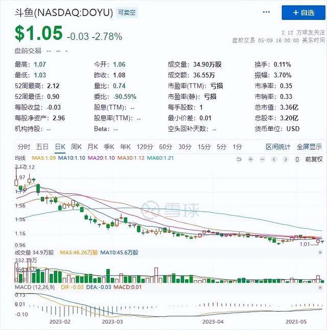 可投资者依旧选择卖出,截至今日美股收盘,斗鱼继续下跌2.78%,报1.05美元/股,市值仅剩3.36亿美元。