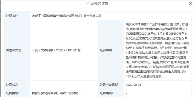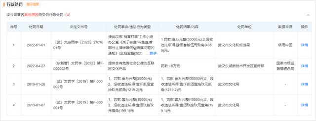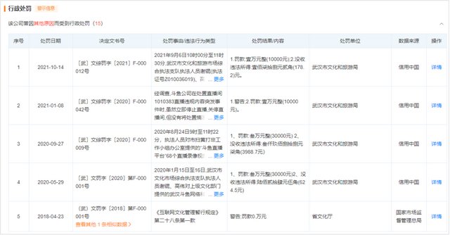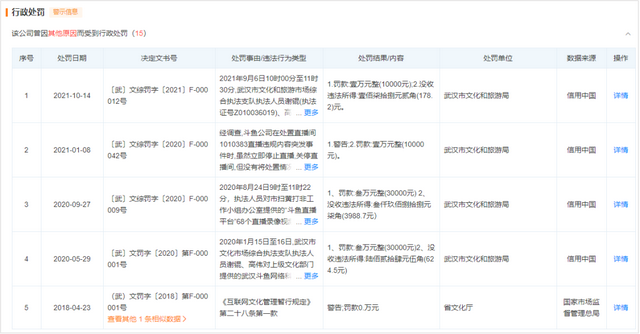 根据天眼查的数据显示,2016年至2022年间,武汉市文化和旅游局等相关部门曾19次对斗鱼作出行政处罚,共计罚款16.5万元。