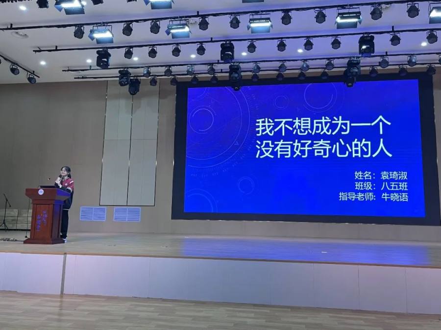 决赛现场由八年级一班董锦妍同学、八年级五班陈奥瀚同学主持,来自八年级的10名选手参加决赛。