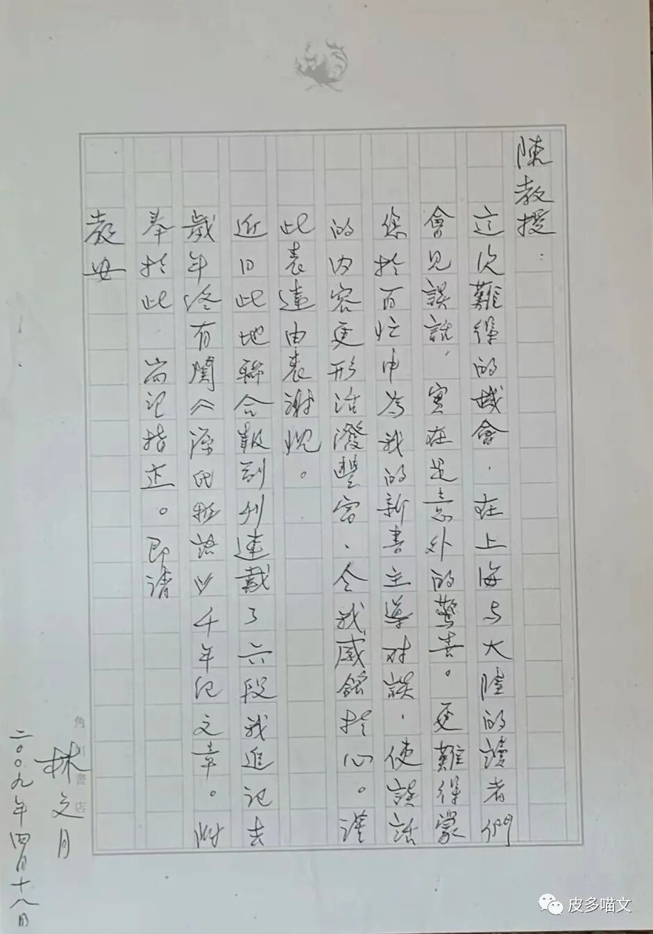 这是又一个向她当面请益的大好机会。我请林先生较为详细地回顾了她的散文创作历程并就她提出的写散文也要善于“经营”的主张请她作了进一步的阐述。我还尊称她也是“上海作家”,因为我认为她的创作、翻译和研究之路,其实都应视为是从上海起步的。林先生对这次对话应该说是较为满意的。回台北后,她先后惠寄我新散文集《写我的书》和新作《千载难逢竟逢:<源氏物语>千年纪大会追记》长文剪报,她同时还致我一信,原信照录如下: