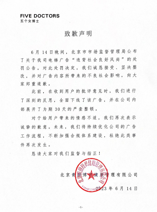“五个女博士”正是在这样的背景下应运而生,进入口服美容市场,但正如“人红是非多”,海上风浪大的地方也容易颠簸,“五个女博士”近日深陷在广告事件的风波中,6月14日晚,北京市市场监督管理局发布了对“五个女博士”电梯广告的处罚公告,随后,“五个女博士”也在第一时间发布致歉声明。