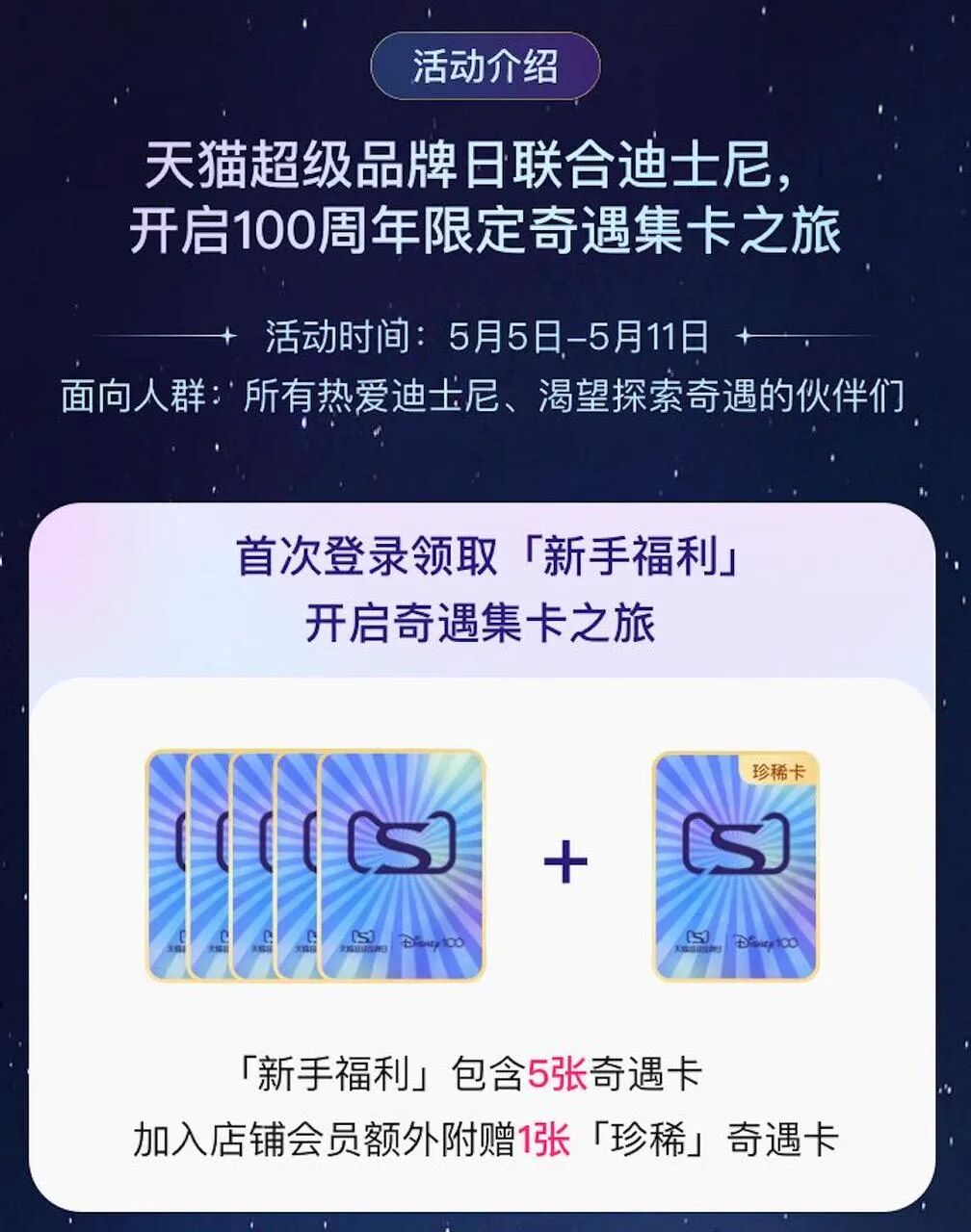 营销方面:充分利用迪士尼丰富的内容 IP 资源进行线上线下联动。在线上,迪士尼专门推出了“线上收集 100 张迪士尼 IP 珍藏卡片”的互动玩法,其中包括特别推出的五张艺术化改造的米奇头卡片,吸引大量用户参与。据悉,用户通过手机淘宝的淘宝拍照功能拍摄任意带米奇的图案,即有机会获得卡片,加入迪士尼重点授权品牌的店铺会员,便可有机会解锁珍稀卡片,获取收藏卡。迪士尼本次天猫超级品牌日以优质内容互动建立桥梁,推动了迪士尼及其合作品牌店铺拉新入会,有效地把迪士尼粉丝人群转化为了品牌用户资产。