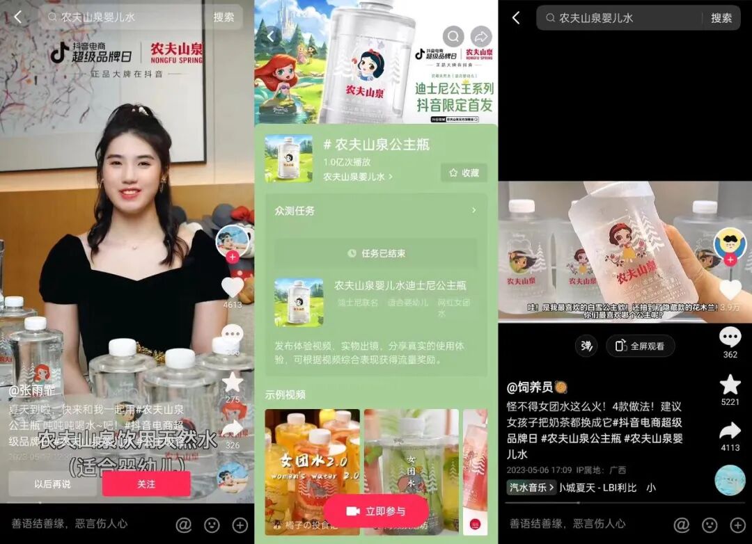 在内容营销侧,超品日活动期间,农夫山泉抖音电商超级品牌日联动站内外场景,通过邀请达人输出优质内容,提升内容热度,放大活动影响力。在直播间,品牌打造色彩斑斓的童话风格主题,主播们也以公主造型进行直播种草。同时借助抖音产品“众测任务”,品牌发起话题#农夫山泉公主瓶,邀请站内达人如蝶泳世界冠军@张雨霏、美食达人@饲养员、母婴达人@苏瑞Siri 等,以产品介绍、美食制作等内容,让农夫山泉迪士尼系列产品向体育、美食、母婴等垂直圈层扩散,为品牌沉淀了兴趣用户。数据显示,通过KOL、KOC在话题下产出视频、图文等优质内容,万赞视频超30个,话题浏览量过亿,产品声量进一步扩大。