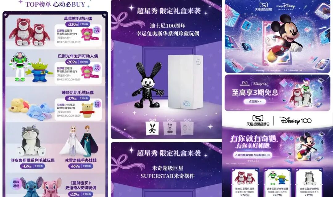 产品方面:迪士尼本次超品日有多个经典IP产品以及上新新品参加,包括漫画家公主娃娃、玩具总动员巴斯光年胡迪手办玩具在内的多个IP系列玩具,定制了100周年系列玩偶及周边。同时,迪士尼本次超品日上新了史迪奇、顽皮鲁弗斯、星战等多个系列新品。