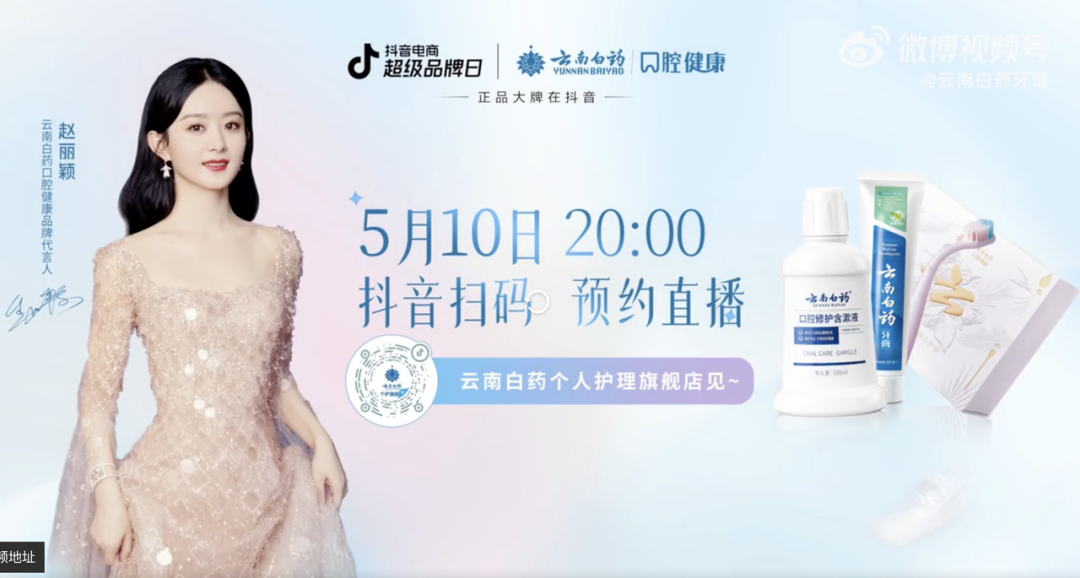 在内容营销侧,品牌在抖音电商内容场景+货架场景两大场域协同的基础上,借助云南白药牙膏明星代言人赵丽颖的影响力,为云南白药在抖音电商的销量爆发造势。首先,品牌在本次超品日预热期、直播、事后等时间点,都利用了明星的宣发价值。