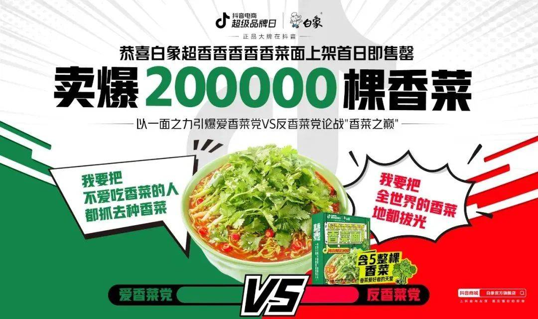 在产品侧,品牌主推产品为首次推出的香菜方便面以及相应限时礼盒。据悉,这是抖音电商超级品牌日“爆款共创”计划的落地首款产品,抖音独家定制口味,上架首日即告罄。在打造新品之前,抖音电商超级品牌日洞察到抖音站内达40亿+播放量的#香菜 话题,以及市面上主打香菜口味的产品空缺机会。随后,联合“电商罗盘”团队挖掘数据,得到“香菜处于绝对的高搜索和低供给的潜力市场”的结论佐证。最后,联合白象品牌一起,从0到1共创出一款包含香菜的新品,即音定制风味白象“超香香香香香香菜面”。除此之外,品牌还有超麻麻麻辣小龙虾拌面、超臭臭臭豆腐拌面、超酸酸酸辣拌面等,以及象地域美食走街串巷系列中蟹黄拌面、红酸汤鱼面、沙嗲海鲜面、胡椒猪肚鸡面等参与超品日。
