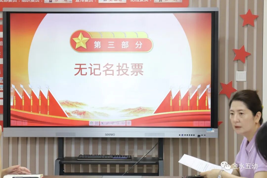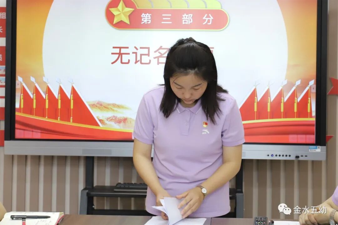 全体党员秉持公平、公正的原则进行无记名投票。最后,全票通过金水五幼党支部推荐出席金水区教育局直属机关委员会换届选举党员代表候选人初步人选为何林杰同志。