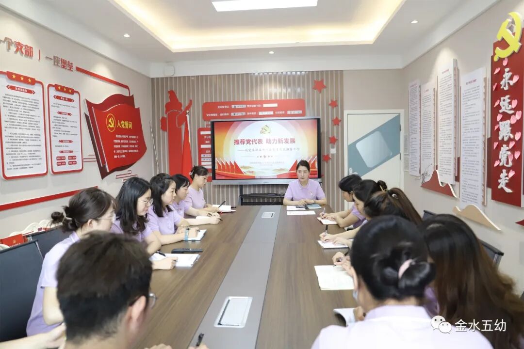 2023年9月13日,金水五幼党支部组织召开党员大会,组织开展局党委换届党代会党员代表推荐工作。党支部书记何林杰同志传达局党委《关于做好推荐出席金水区教育局直属机关委员会换届选举党员代表大会代表候选人初步人选工作的通知》,并介绍关于换届选举详细分配原则。