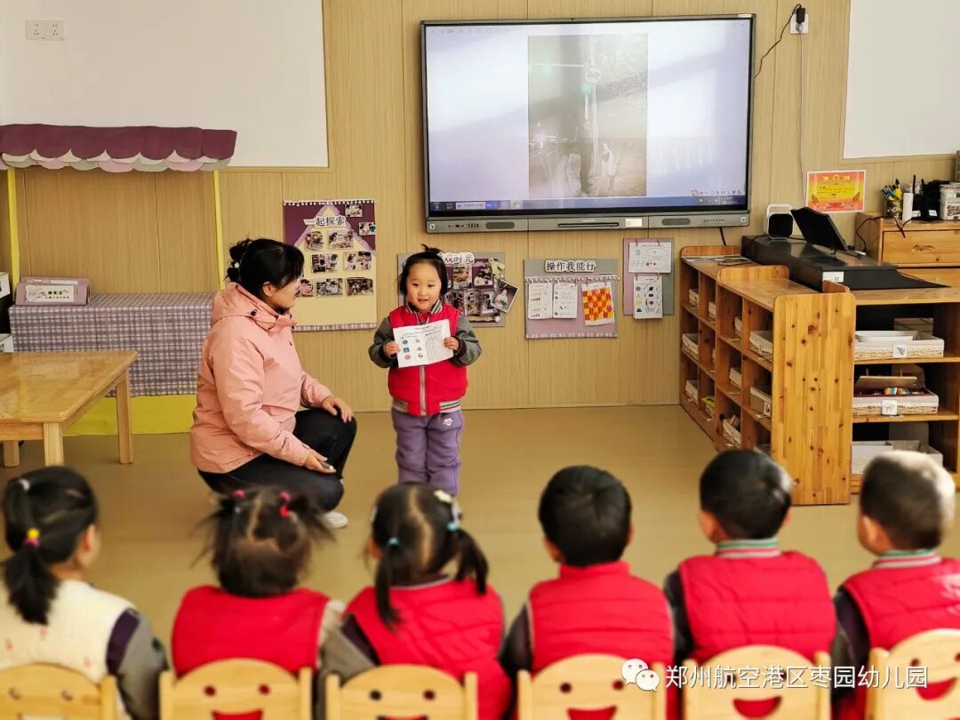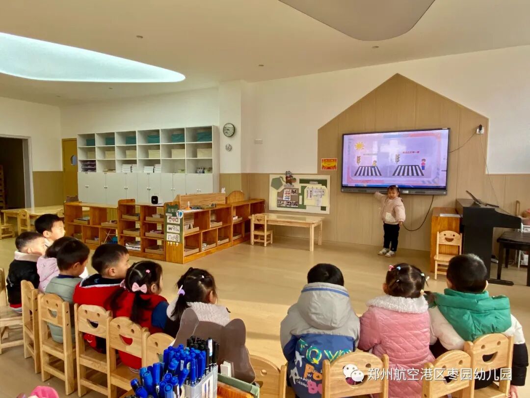 老师们通过视频、故事的方式引导幼儿认识交通标志,掌握必要的交通安全常识,知道步行走人行横道、通行遵守交通信号灯、不在马路上玩耍、乘车不把头伸出窗外等安全知识,懂得遵守交通规则的重要性。