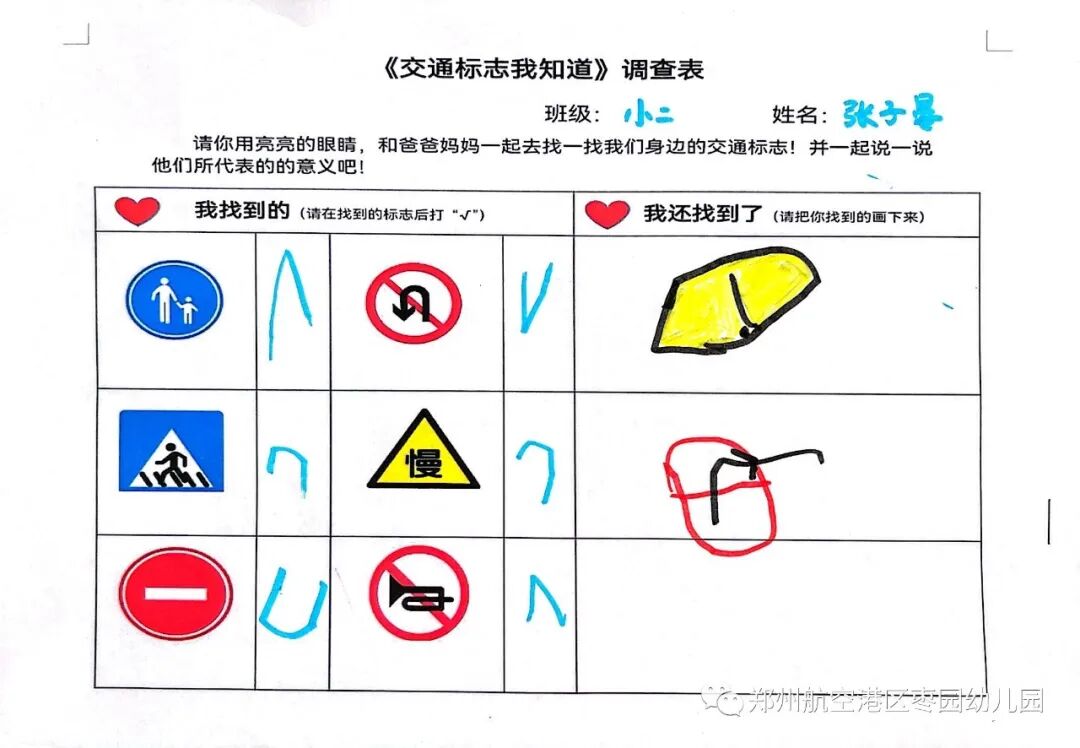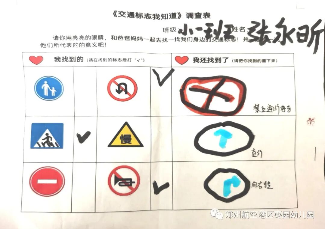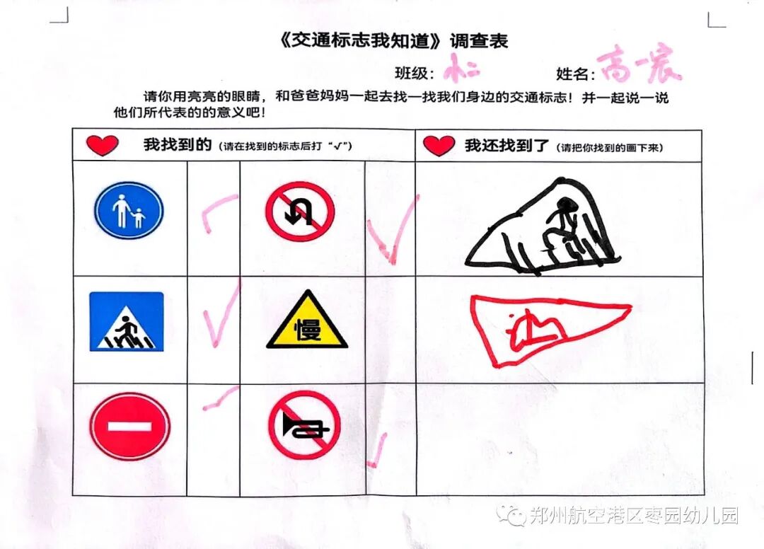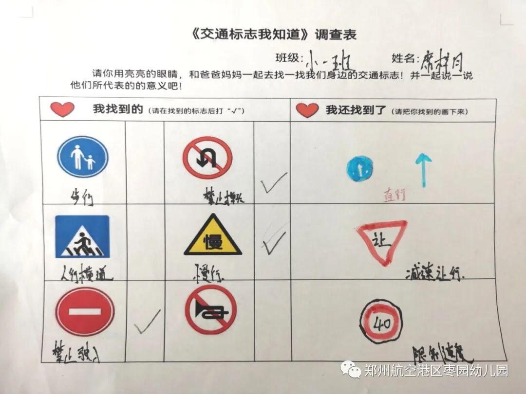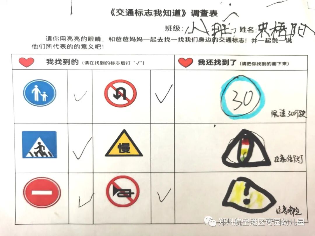 教育来源于生活,又回归于生活。幼儿和爸爸妈妈一起完成《交通标志我知道》调查表,寻找身边的交通标志,将在集体活动中了解到的标志含义讲给爸爸妈妈听,和爸爸妈妈约定遵守交通规则,并和小朋友一起分享自己所找到的标志图。在找一找、说一说、做一做中,丰富了幼儿的交通安全知识,提高了交通安全意识。