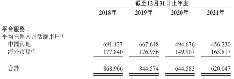 具体来看,快狗打车的托运人平均月活跃用户由2018年的86.90万名降至2021年的62.00万名,同比下滑约28.7%,其中中国内地市场降幅达34%;活跃司机人数由21.68万名降至21.35万名,占注册司机的比例亦由17%降至4%。