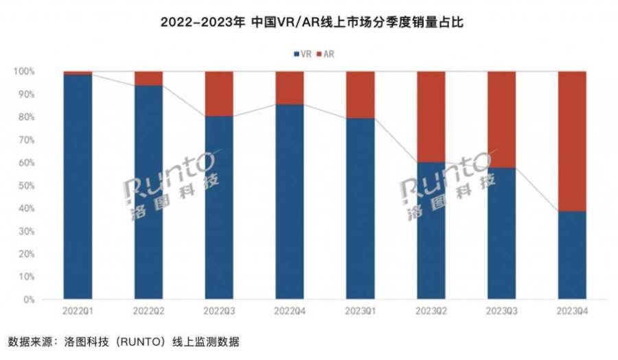 以AR/VR/MR头显为代表的虚拟现实产业正在经历一场寒冬。根据洛图科技发布的新一期《中国消费级XR市场调研报告》,报告指出 2023 年中国消费级XR市场暴跌34%,相关设备全渠道销量为61.3 万台。同样地,美国市场也大幅下滑,2023年 VR、AR 硬件的市场规模下跌了40%,仅有 6.6 亿美元。