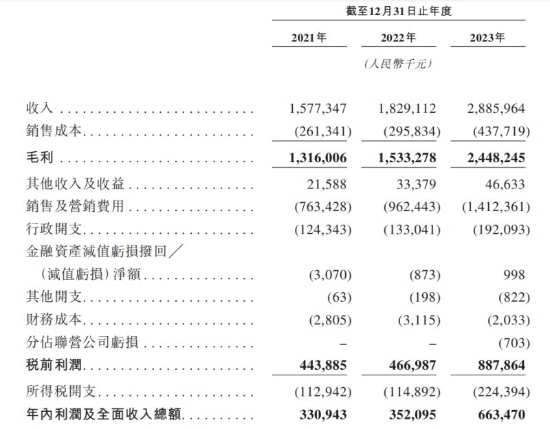 总算是“熬”出头的毛戈平总营收从2021年的15.77亿增至2022年18.29亿,并于2023年进一步扩张至28.86亿,2021至2023年的复合年增长率为35.3%;净利润也从2021年的3.31亿,增至2023年的6.64亿,复合年增长率高达41.6%。