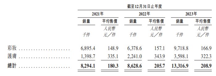 从最新招股书数据看,2023年毛戈平迎来“价量齐升”,销量大幅增长超50%的同时,平均售价也在涨,由2022年的157元涨至2023年的167元。