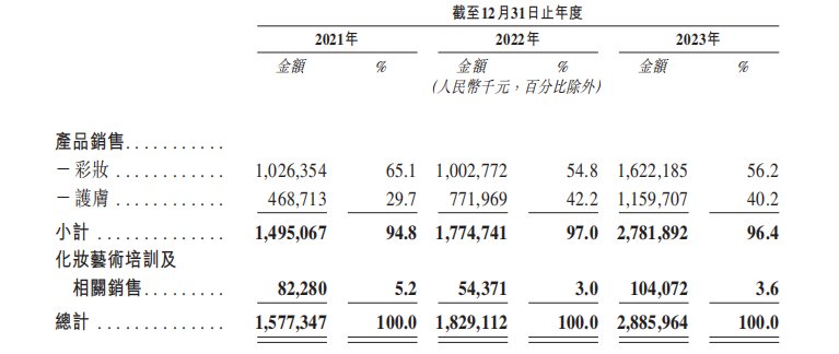 截至2023年底,毛戈平的产品组合包括两个品牌的378个单品,涵盖334个彩妆单品以及44个护肤单品。2023年,彩妆和护肤产品销售收入分别占产品销售总收入的58.3%和41.7%。