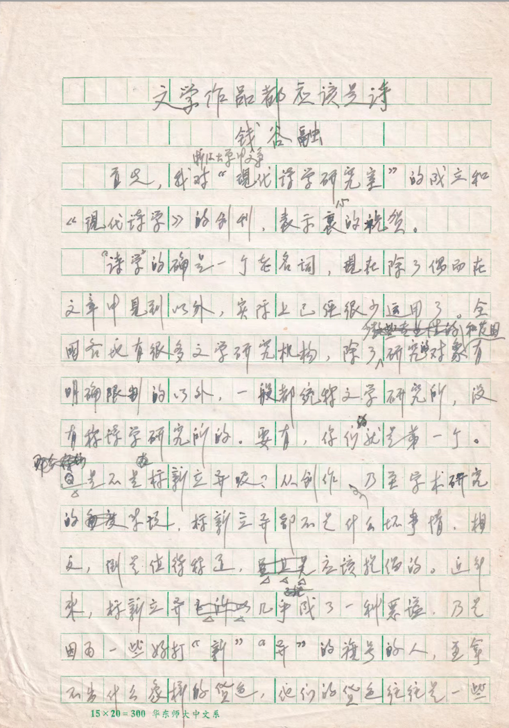 钱谷融先生《文学作品都应该是诗》手稿第一页
