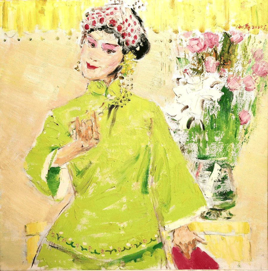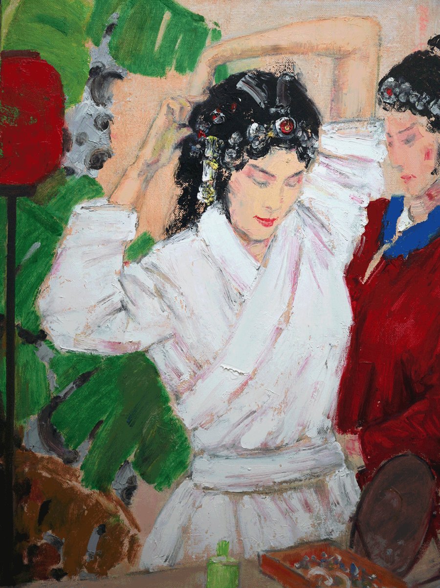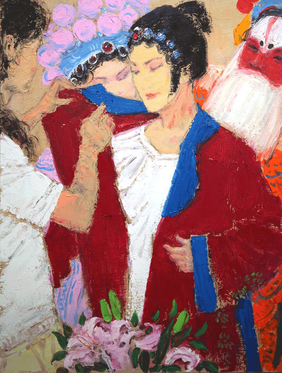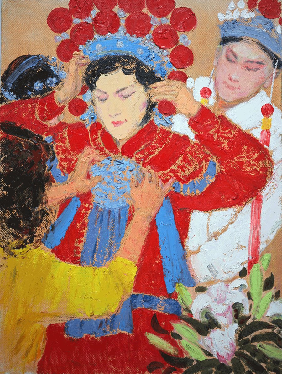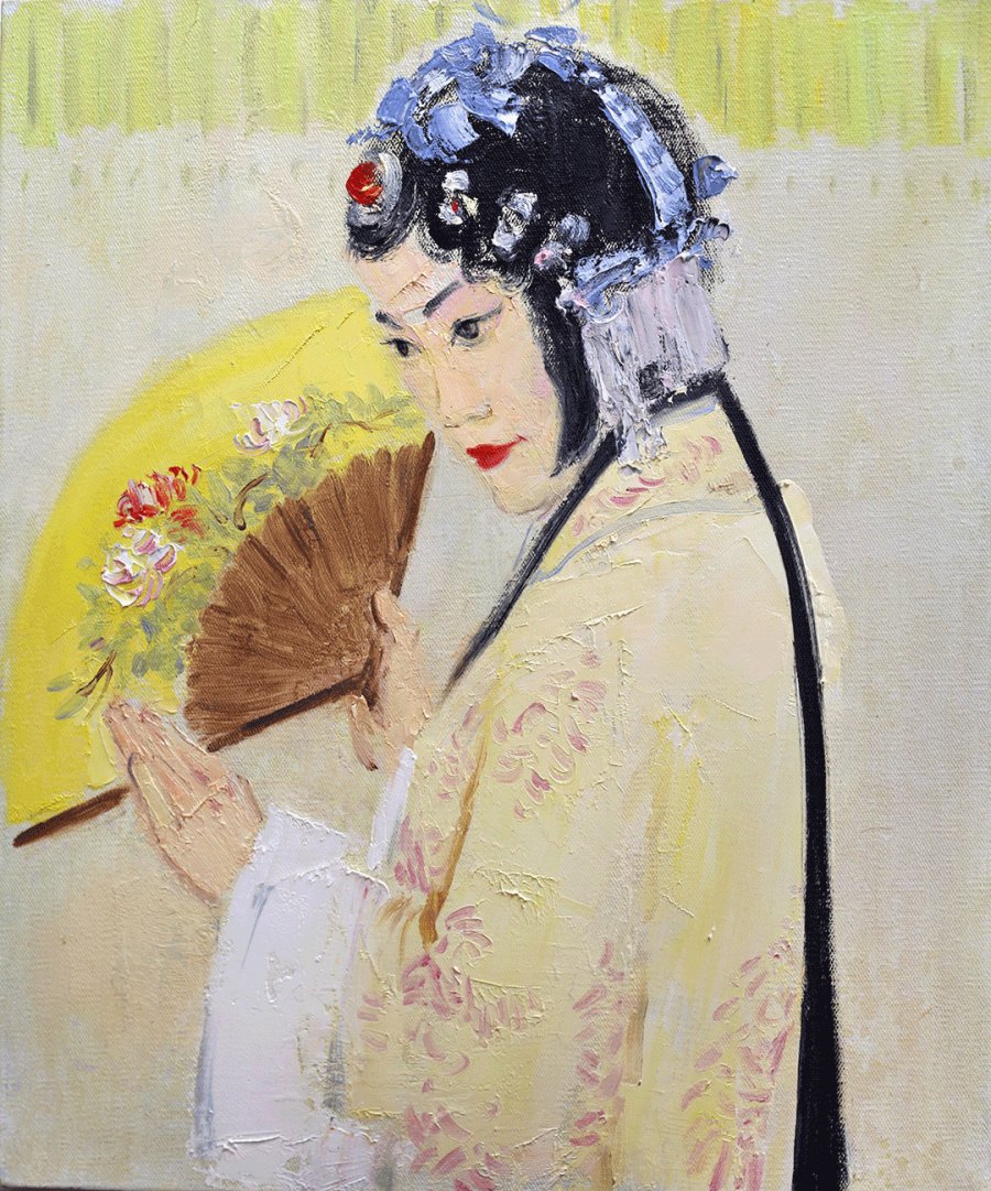 岳海涛近年的创作中延续了戏曲人物的创作主题,以表现演员上台前的状态的“出场”系列参加了全国美展等重要的展览,以自己的理解来关注传统文化在当代油画中的演绎。从八十年代开始在油画创作道路上求索算起,近四十年的创作经验是如何发酵的。岳海涛说:“我所生活的齐鲁大地的孔子文化是出世的与积极的价值观,这种积极的文化价值观,在戏剧表演艺术中也做了很好的体现与承载,并以表演艺术的方式体现出来。例如:戏剧艺术中《打渔杀家》《锁麟囊》《红娘》等剧目所象征或传承的传统美德的文化符号,通过油画方式体现出来,传达传统文化的价值观与审美取向是我艺术创作的动力。”