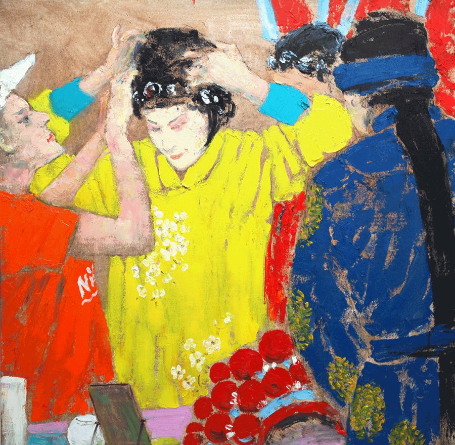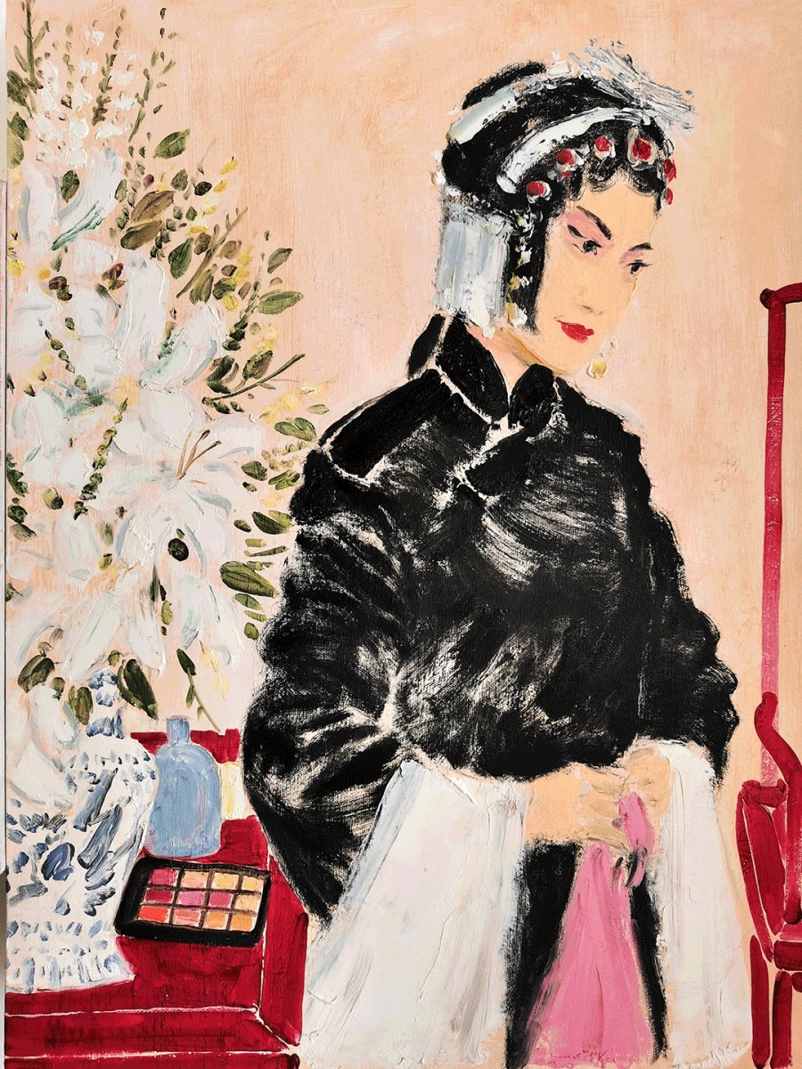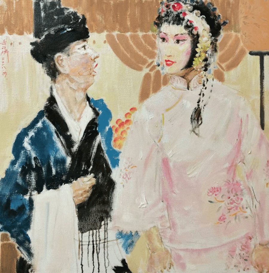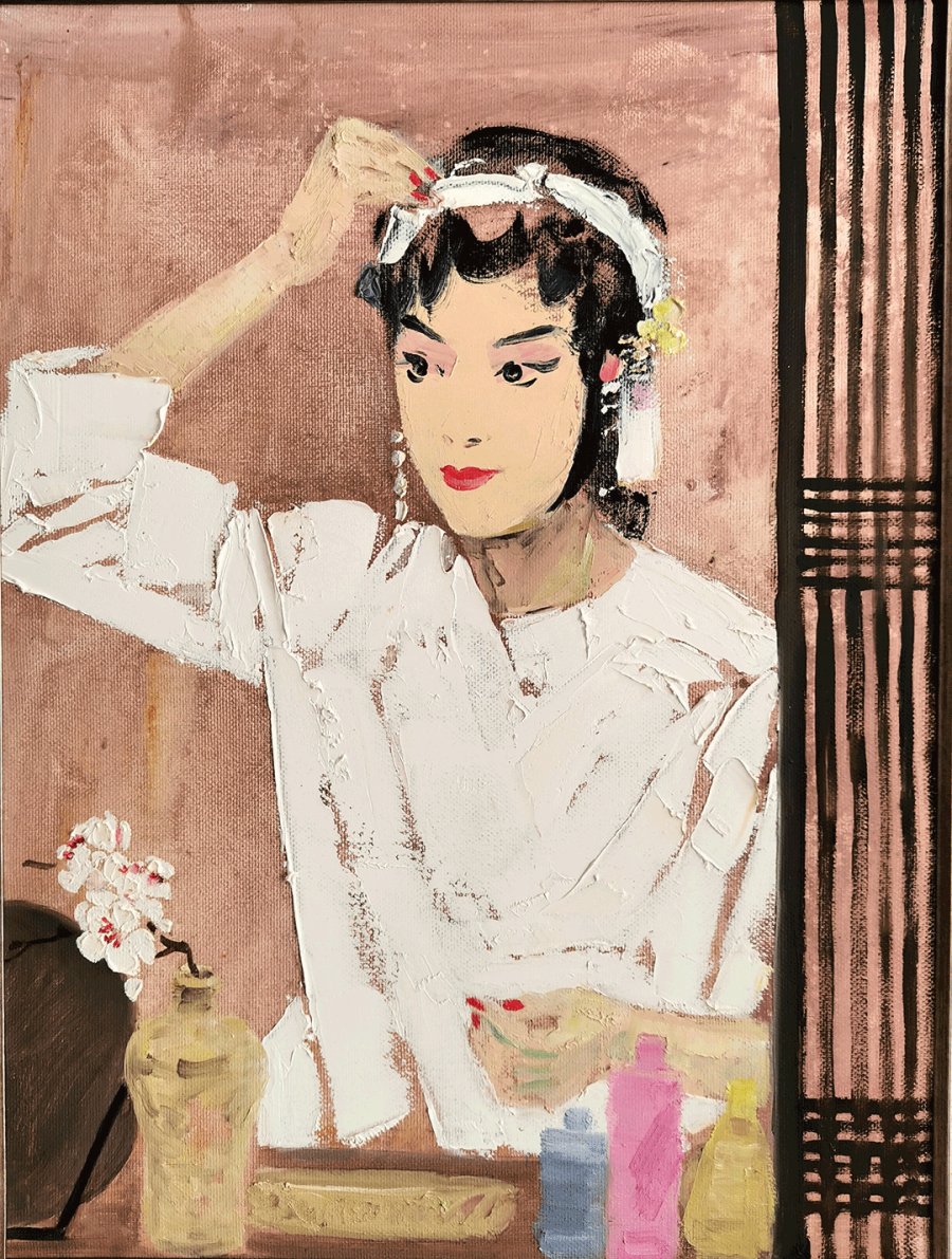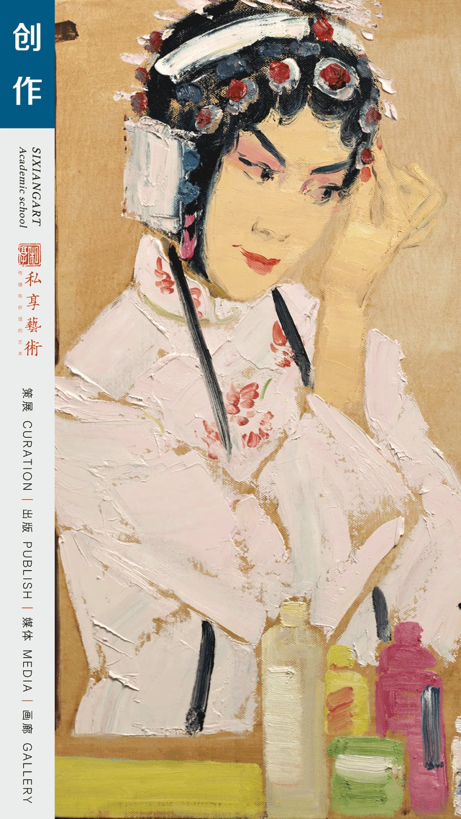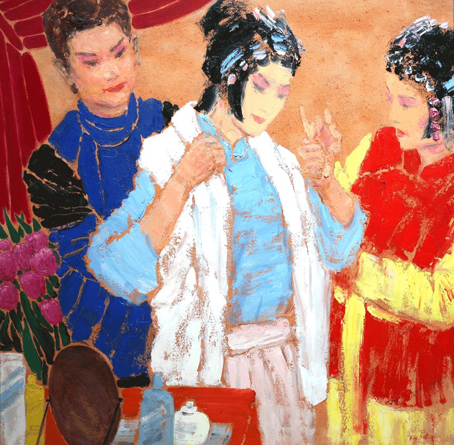 岳海涛近年的创作中延续了戏曲人物的创作主题,以表现演员上台前的状态的“出场”系列参加了全国美展等重要的展览,以自己的理解来关注传统文化在当代油画中的演绎。从八十年代开始在油画创作道路上求索算起,近四十年的创作经验是如何发酵的。岳海涛说:“我所生活的齐鲁大地的孔子文化是出世的与积极的价值观,这种积极的文化价值观,在戏剧表演艺术中也做了很好的体现与承载,并以表演艺术的方式体现出来。例如:戏剧艺术中《打渔杀家》《锁麟囊》《红娘》等剧目所象征或传承的传统美德的文化符号,通过油画方式体现出来,传达传统文化的价值观与审美取向是我艺术创作的动力。”