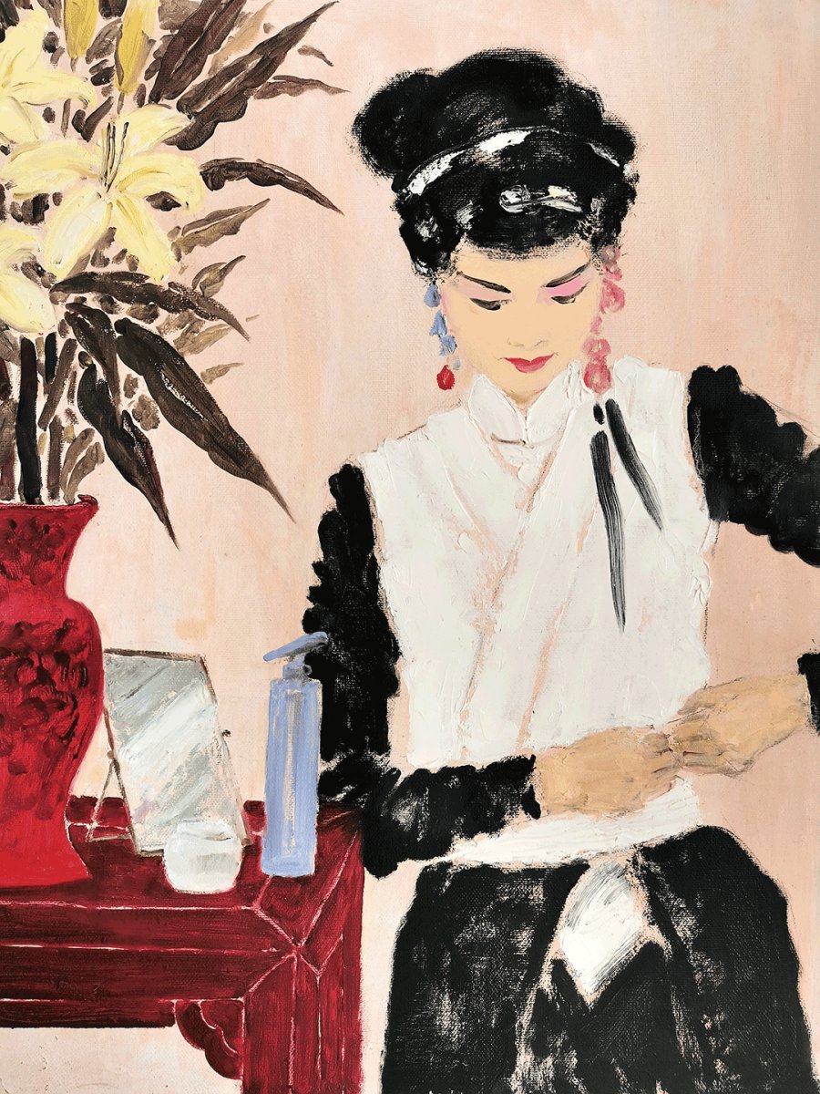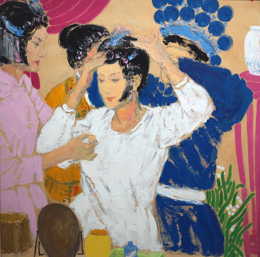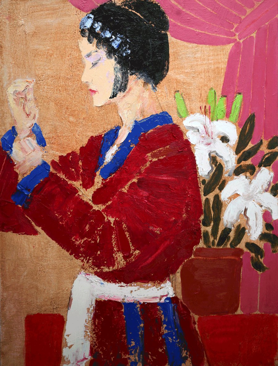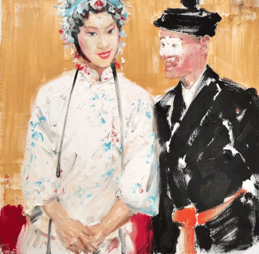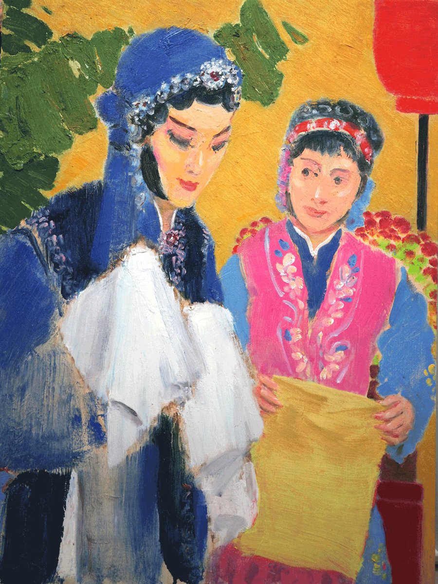 岳海涛近年的创作中延续了戏曲人物的创作主题,以表现演员上台前的状态的“出场”系列参加了全国美展等重要的展览,以自己的理解来关注传统文化在当代油画中的演绎。从八十年代开始在油画创作道路上求索算起,近四十年的创作经验是如何发酵的。岳海涛说:“我所生活的齐鲁大地的孔子文化是出世的与积极的价值观,这种积极的文化价值观,在戏剧表演艺术中也做了很好的体现与承载,并以表演艺术的方式体现出来。例如:戏剧艺术中《打渔杀家》《锁麟囊》《红娘》等剧目所象征或传承的传统美德的文化符号,通过油画方式体现出来,传达传统文化的价值观与审美取向是我艺术创作的动力。”