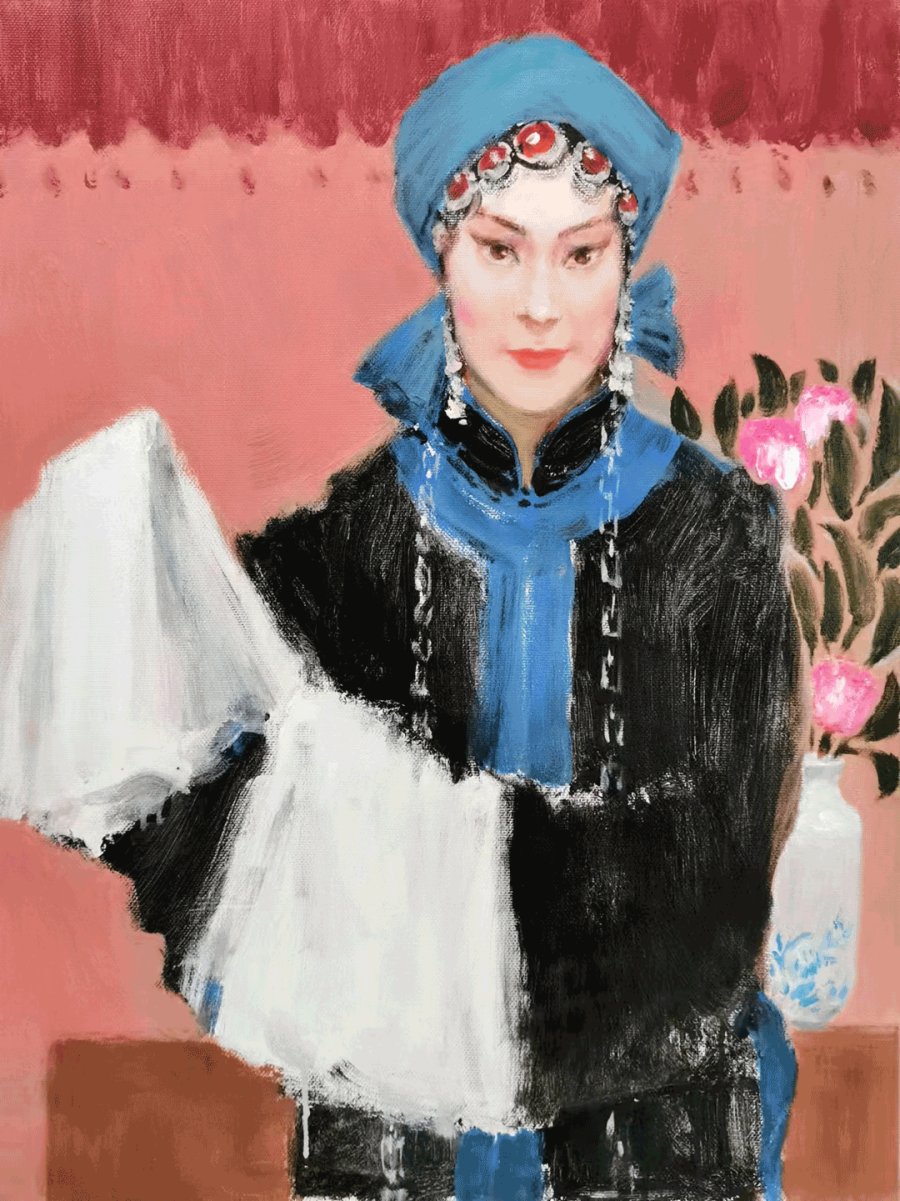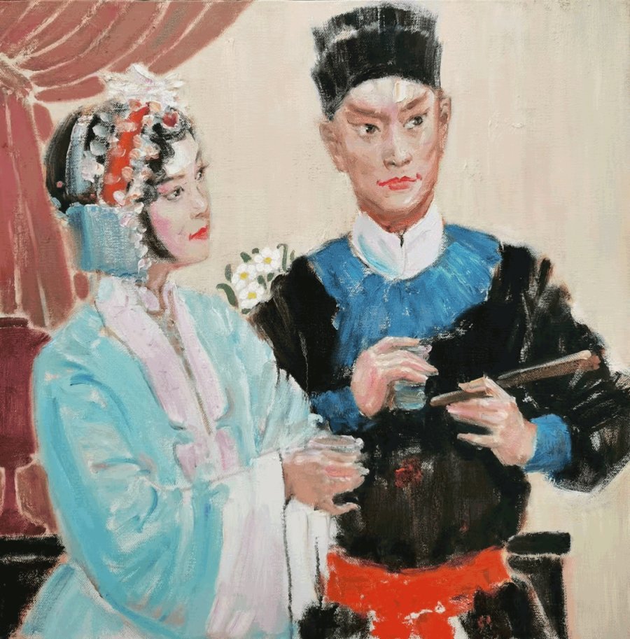 具象表现的油画表现形式,在我看来很适合表现夸张的、抽象化的戏曲人物,而这种方式也是我所擅长的。中国戏曲演员的着装与扮相,每个角色都有着丰富的个性的造型,乃至符号化造型。生、旦、净、末、丑都有角色的独有颜色,再加上戏服的演变流传,色彩变化也很丰富且符号化。民族文化语言的色彩夸张与色彩张力,所传达出的表现性,十分适合通过油画的方式表现出来。