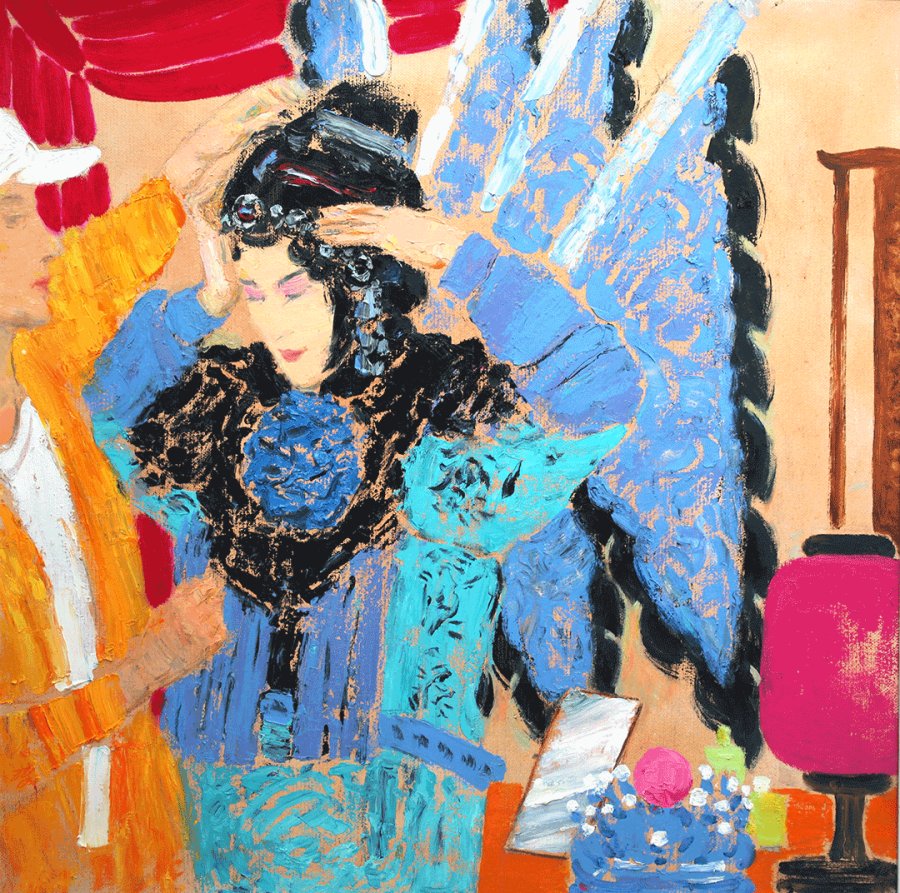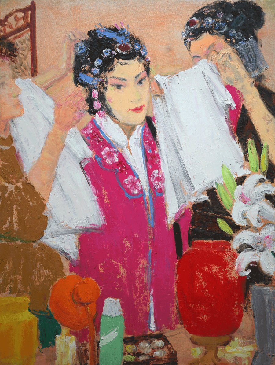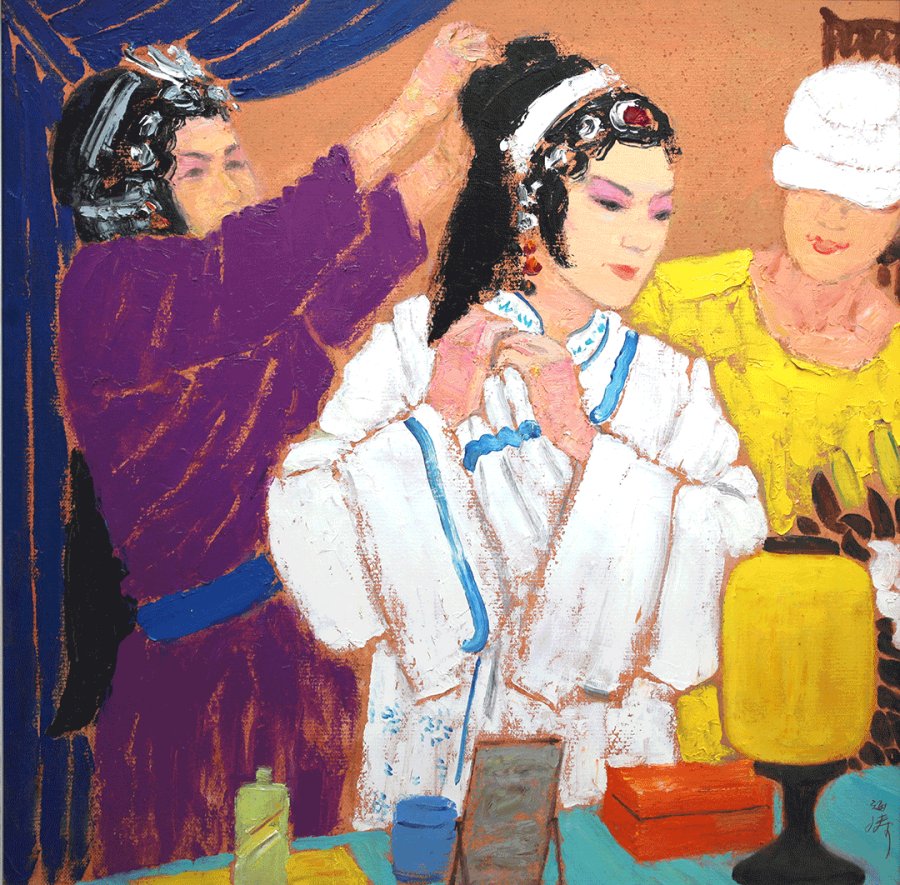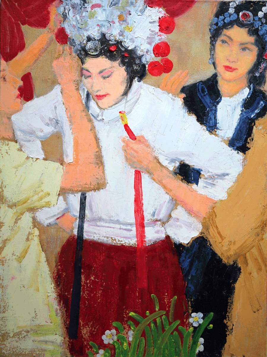 “出场”系列是我近年创作的系列作品,以系列的方式表现戏剧演出后台中演员上台前的状态——上场前既紧张又兴奋的内心世界——演员一旦上场心态反而单纯了。这些年来的艺术创作,基本都是这个系列题材的作品。