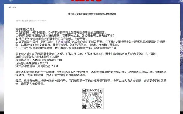 根据腾讯官方的说法,因合约到期,6月20日起DNF手游将不再上架部分安卓平台的应用商店。使用相关安卓应用商店的玩家还可以在游戏内进行更新。游戏内更新出现问题的玩家可以到官网进行重新下载游戏。