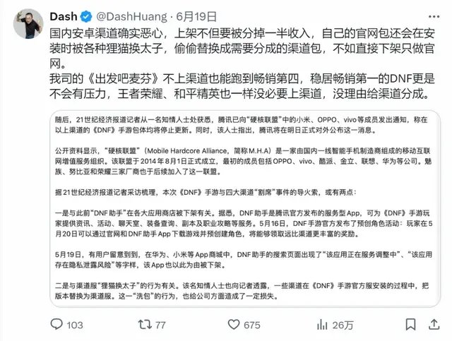 2021年时,腾讯就曾经和华为商城发生过争端,矛盾的核心正是《王者荣耀》等腾讯系游戏的分成比例。两家公司在“全面开战”之后,仅用时一天就全面和解。然而,此次《地下城与勇士 起源》与渠道的争端,双方都没有缓和矛盾的迹象。已经过去一周以上的时间,地下城勇士还是没有在安卓渠道重新上架。