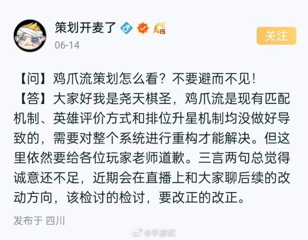 策划尧天棋圣在官方公告中承认,鸡爪流策略的出现反映了当前匹配机制、英雄评价方式和排位升星机制的不足。为了解决这一问题,官方将对整个系统进行深入的重构和改进。